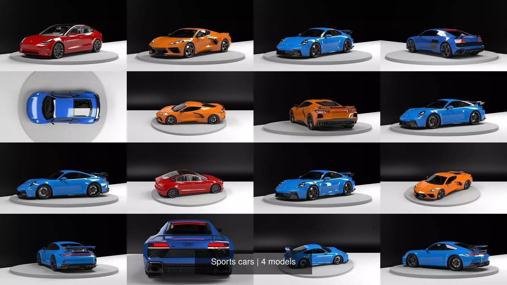 Porsche 911 GT3 (Detailed exterior and interior with textures)Audi R8 (Detailed exterior and simple interior)Chevrolet Corvette C8 (Detailed exterior and simplier interior with textures)Tesla Model 3 (Detailed exterior and simplierinterior with textures)