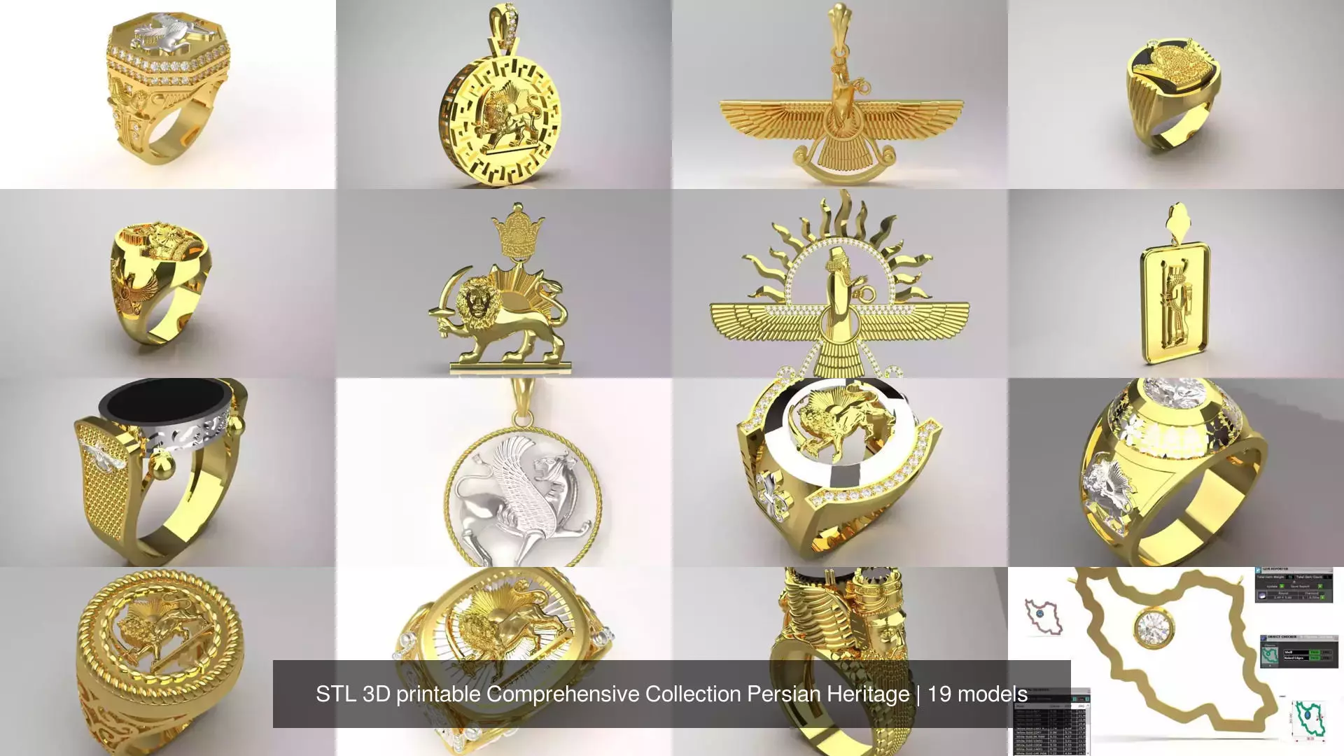 ** Main content of the package (20 ready-to-print files):**| Section | File Code | Product Description | Main Symbol and Details || :--- | :--- | :--- | :--- || VIP Rings | mr0320 | Two-tone Lion and Sun Ring | Lion and Sun, Black Enamel Background, Two-tone (Gold/Silver) || | mr0147 | Horseshoe Lion and Sun Ring | Diamond-cut horseshoe frame, embossed lion and sun, two-tone || | mr0150 | Rope-bordered Lion and Sun Ring | Lion and Sun, round rope ring, body with open slimes || | mr0155 | Two-tone Lion and Sun Ring, Highly Detailed | Lion and Sun, Highly Detailed, Two-tone Wings on the Side of the Ring || | mr0197 | Winged Darius and Forouhar Ring | Bulky Ring, Symbol of Ahura Mazda and Forouhar, Gold-Plated || | mr0065 | Round and Bulky Lion and Sun Ring | Combination of several symbols (lion and sun, crown, Forouhar) in a round design || | mr0137 | Falcon and onyx ring | Black onyx oval frame, falcon/simorgh on the side, matte and shiny gold || | mr0302 | Forouhar ring in octagonal frame | Forouhar symbol inside the necklace frame, octagonal with delicate details || | mr0148 | Solitaire ring with national symbols | Large solitaire, lion and sun on the side, luxurious and inlaid design || | mr0001 | Crown and winged lion signet ring | Crown, winged lion, octagonal, stonework all around || | mr0062 | Crown and Greek meander signet ring | Crown, black enamel, Greek pattern (Meander) || | mr0054 | Bulky Crown Signet Ring | High Detail Crown, Black Background, Grooved Body Design || Main Pendants | gp0097 | Lion and Sun Pendant with Crown | Full and High Detail Design (Lion, Sun, Sword, Crown) || | jp0159 | Circular Lion and Sun Pendant | Gold Circle, Embossed Symbol, Stonework Pendant || | gp0260 | Winged Lion Pendant (Homa) Rope Frame | Winged Lion in Round Rope Frame, Classic Design || | gp0160 | Classic Foruhar Pendant | Foruhar Symbol, Gold, Volumetric and Original Design || | jp0182 | Luxury Foruhar Pendant with Stonework | Foruhar, Sun, Delicate Stonework, Glamorous Design || | gp0156 | Achaemenid Soldier Pendant (Immortal Guard) | Achaemenid Soldier in Rectangular Frame, Plaque Style Design || | jp0178 | Iran Map Pendant with Central Diamond | Map Contour, Large Central Diamond/Solitaire |