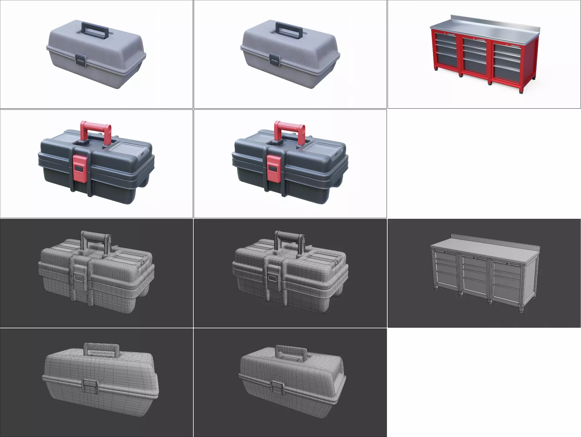 Storage Collection, part of my Tools and Workbench Collection that I made using Blender. This is a small collection that includes 3 storage models. It includes a tool box and a simple tool box that both have high poly and low poly variations as well as a workbench.