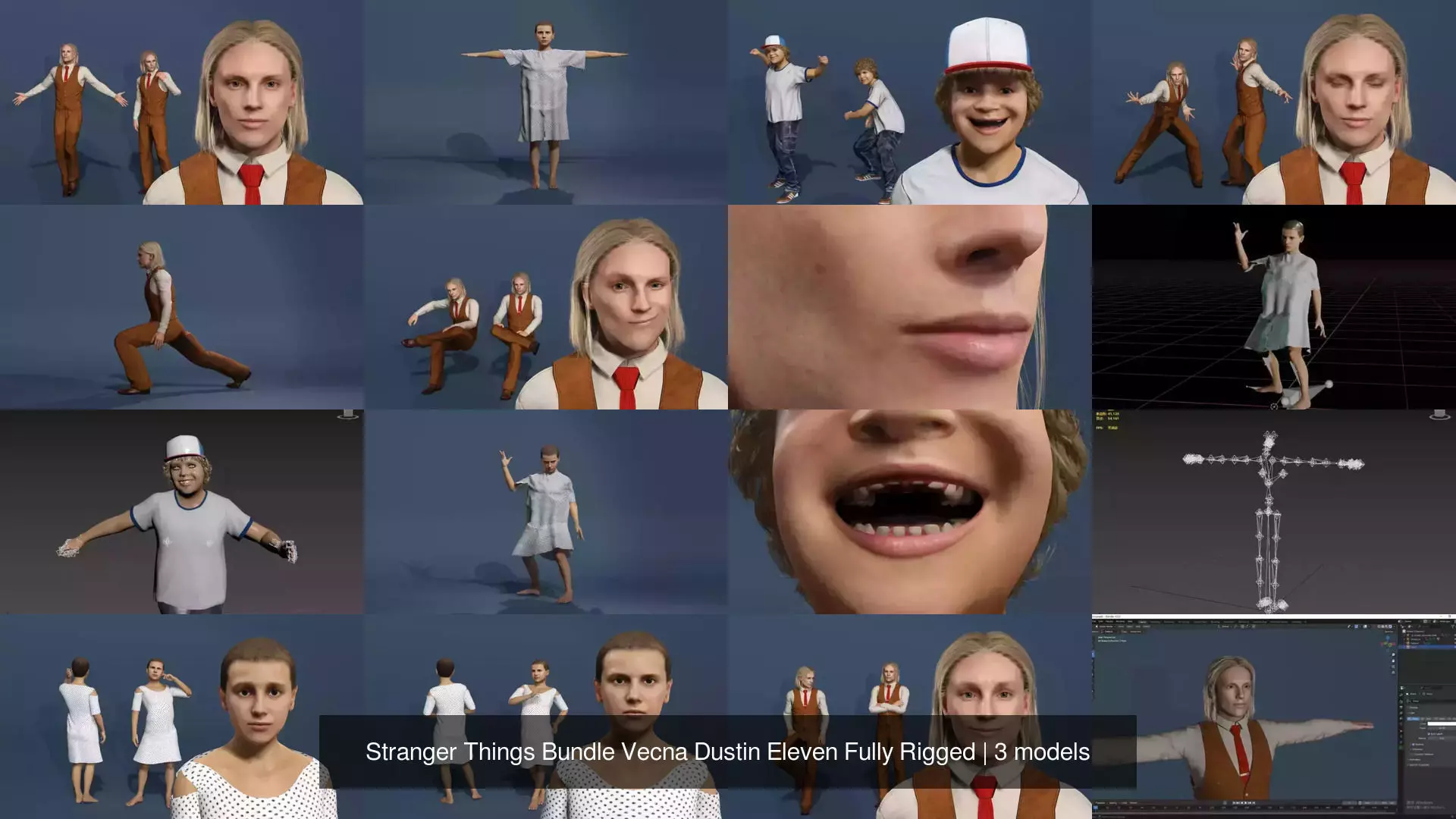 产品概要: 本资产包包含《怪奇物语》(Stranger Things)系列中的三个核心角色:Dustin Henderson(第一季无牙经典版)、Eleven 以及大反派 Vecna。所有模型均按照工业标准制作,具备极高的写实度与技术细节。
