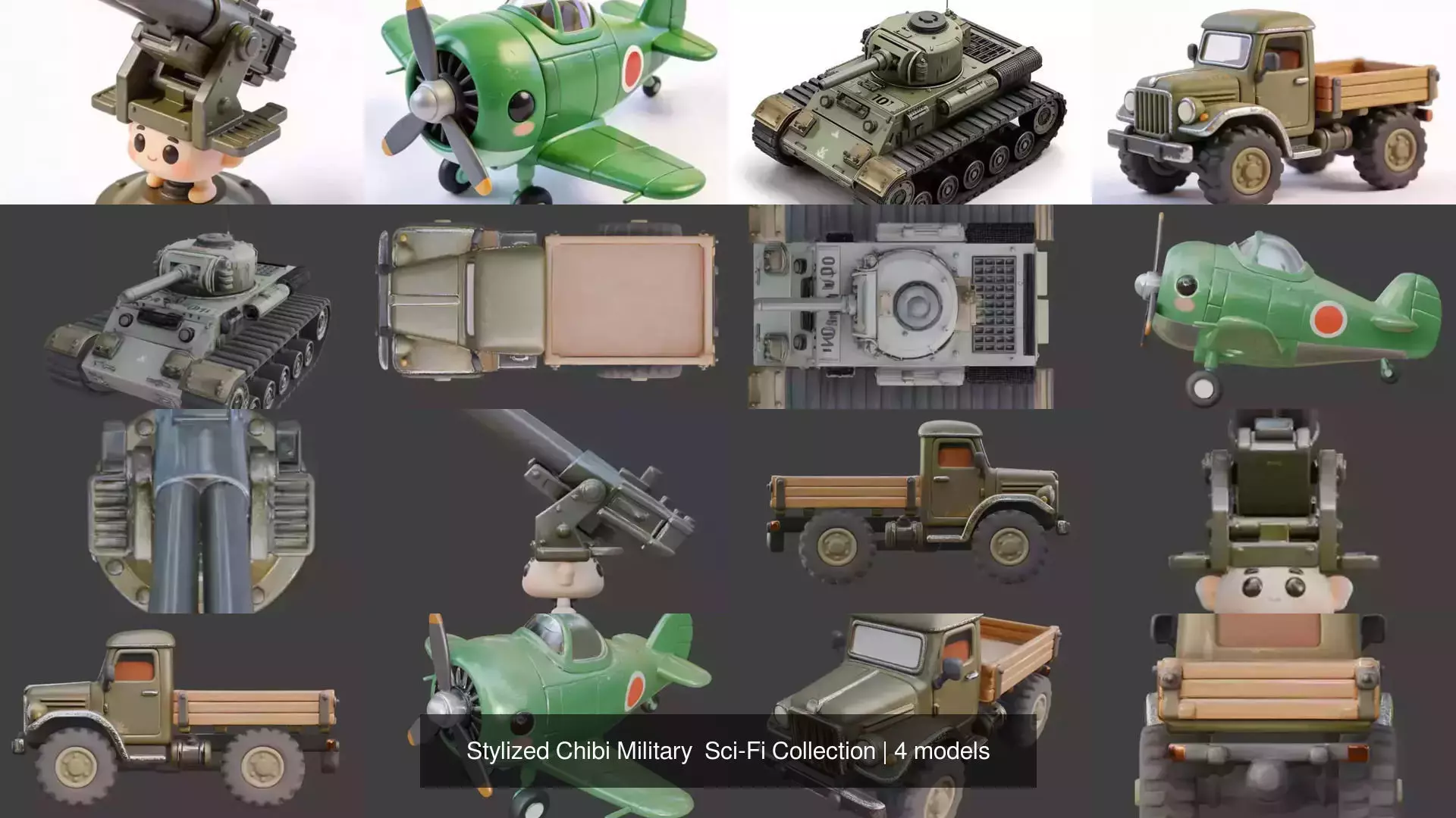 Models included in this collection:• Stylized Chibi Sci-Fi Battle Tank 3D• Stylized Chibi WWII Anti-Aircraft Gun• Stylized Chibi WWII Military Truck• Stylized Chibi WWII Zero Fighter 3D