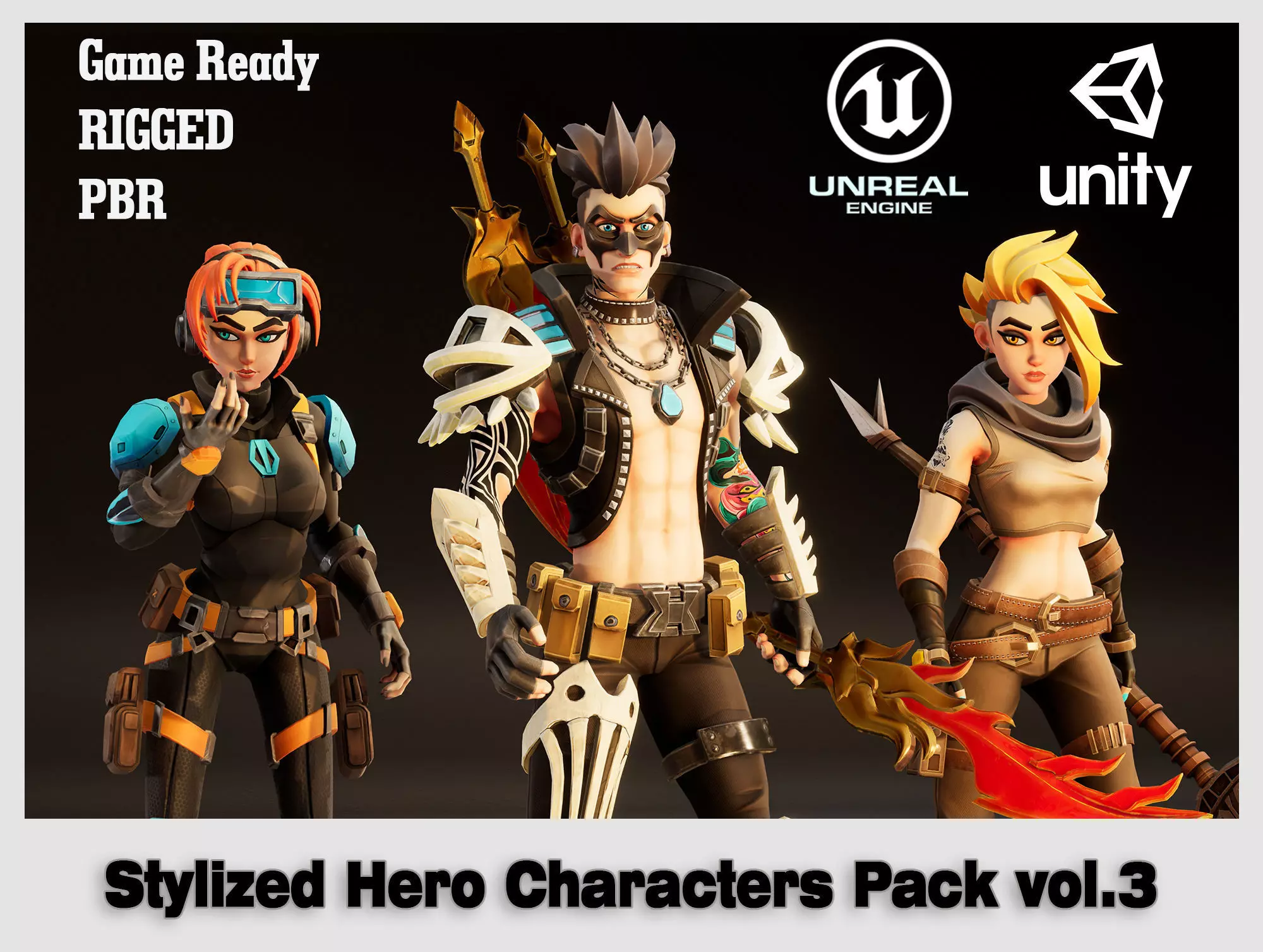 What’s included:3 Stylized Characters9 Skins total (3 per character)Game-ready topologyOptimized for real-time useClean UVsPBR texturesConsistent stylized art direction