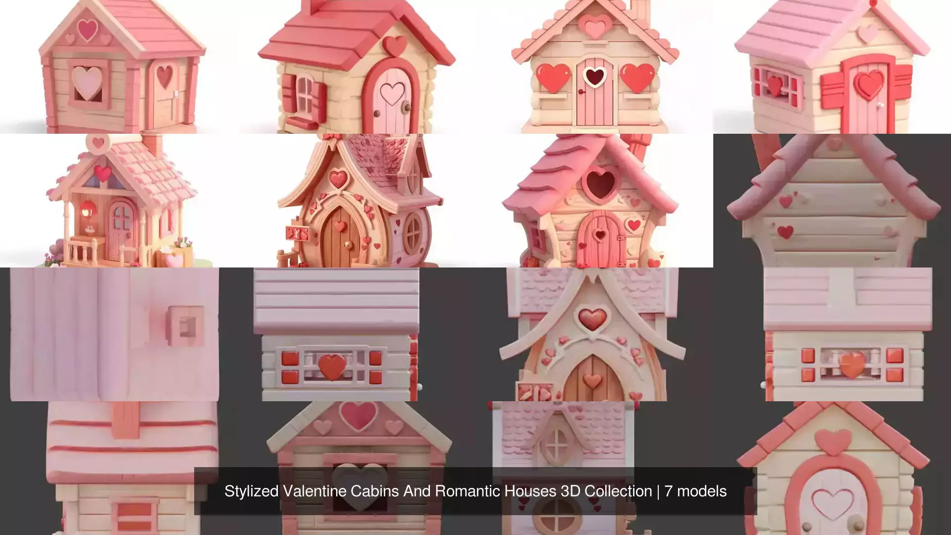 A charming and romantic collection of stylized Valentine-themed cabins and houses, designed with soft shapes, cozy details, and love-inspired aesthetics.This collection is perfect for Valentine’s Day scenes, romantic game environments, cozy villages, animations, seasonal decorations, and stylized world-building.