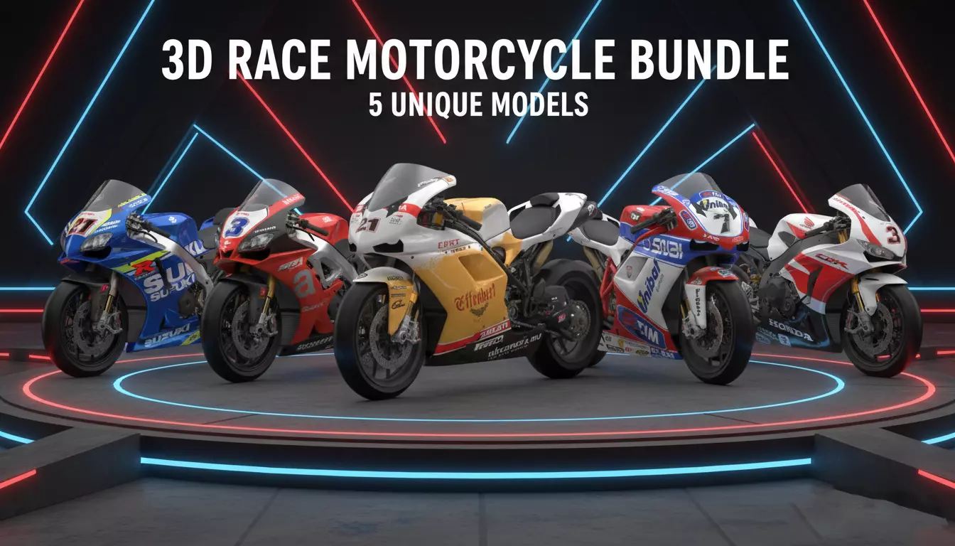 Dominate the track with this premium superbike bundle. Features five iconic liter-class sport bikes from the world's top manufacturers, each meticulously detailed with racing configurations for motorcycle games, racing sims, and automotive projects.