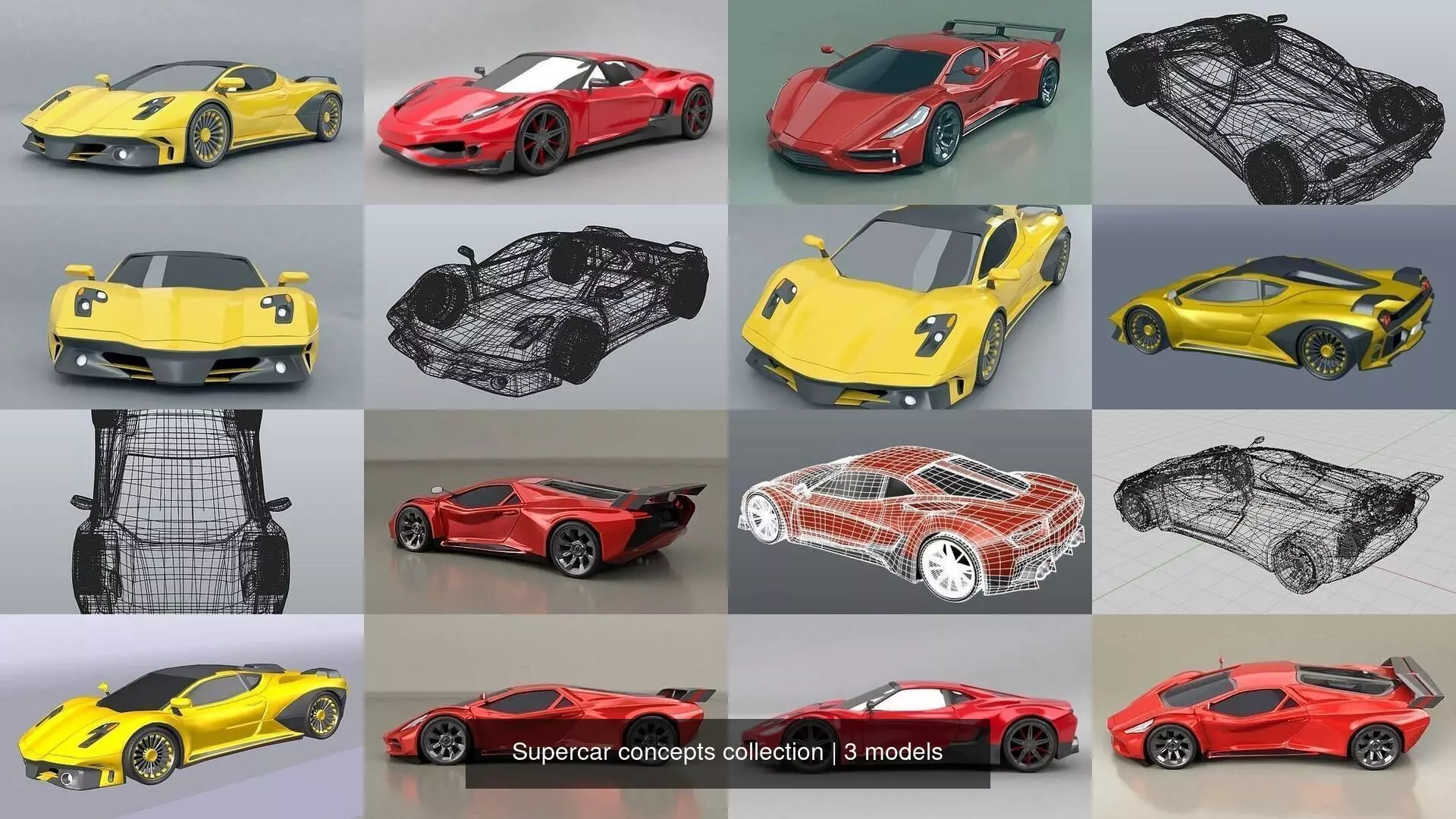 My concept cars collection.My popular Supercars designed by me with blender3d software.Realistic renderings created with cycles rendering engine.In blender file you can remove subsurface modifier if you wish to modify it,or use em with less polygons.Also you can export to OBJ,FBX,COLLADA