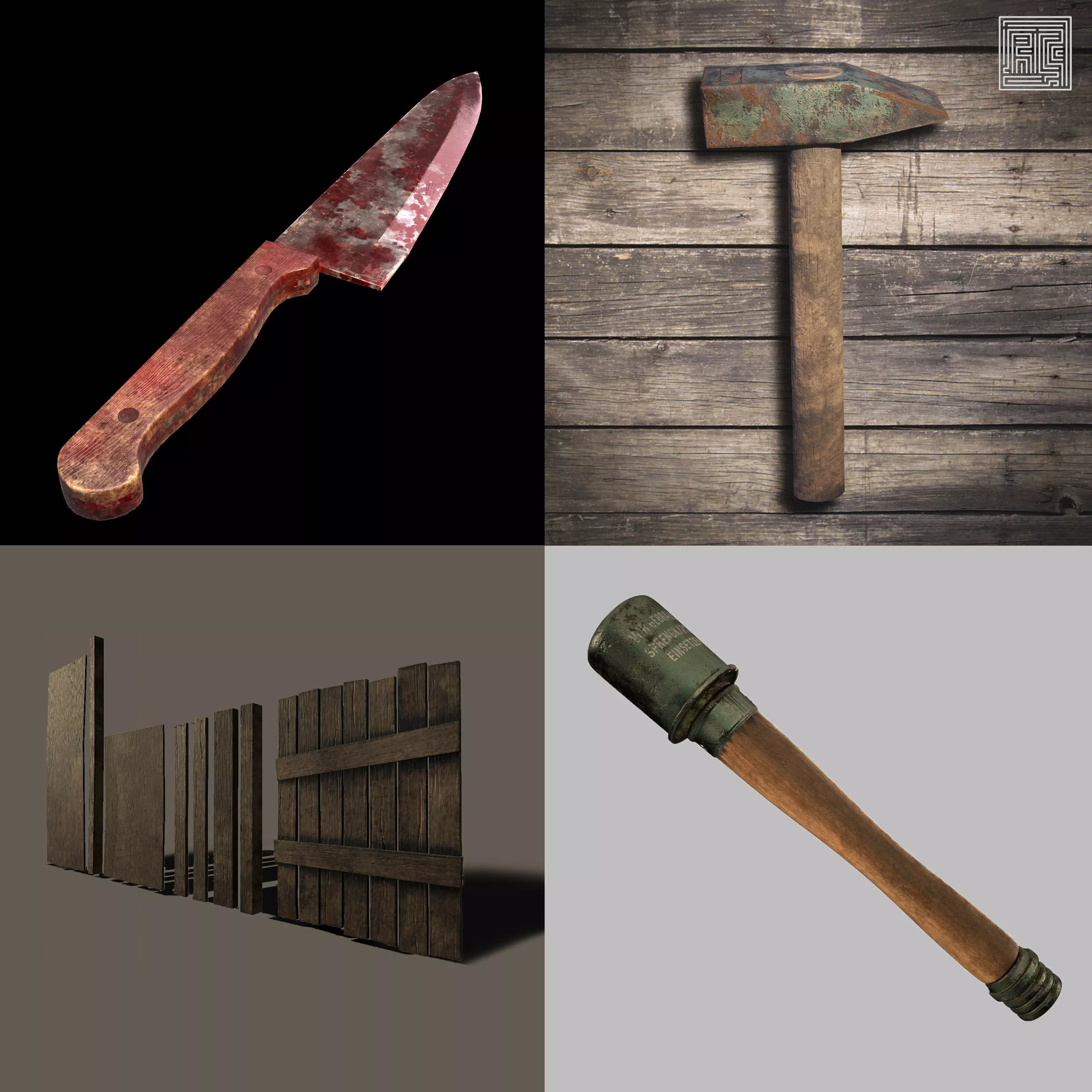 Nice, High resolution!! 2048x2048 px textures Old Hammer Tool Low Poly RC (Game Ready) The model have fully textured and was originally modeled in 3ds Max 2019 Polygons = 121 very low poly and realistic! Nice, High resolution!! 2048x2048 px (png 16) texturesButcher Knife Old Wooden Handle - Game Ready - RC - The model have fully textured and was originally modeled in 3ds Max 2019 *Polygons = 370 * very low poly and realistic! Nice, High resolution!! 2048x2048 px (png 16) texturesOld Plywood Set RC (Game Ready) All models have fully textured and was originally modeled in 3ds Max 2014Nice, High resolution!! 2048x2048 px (png 16) texturesAny question feel free to contact me pls!Also check out my other models copyright - https://www.cgtrader.com/rcaprazr