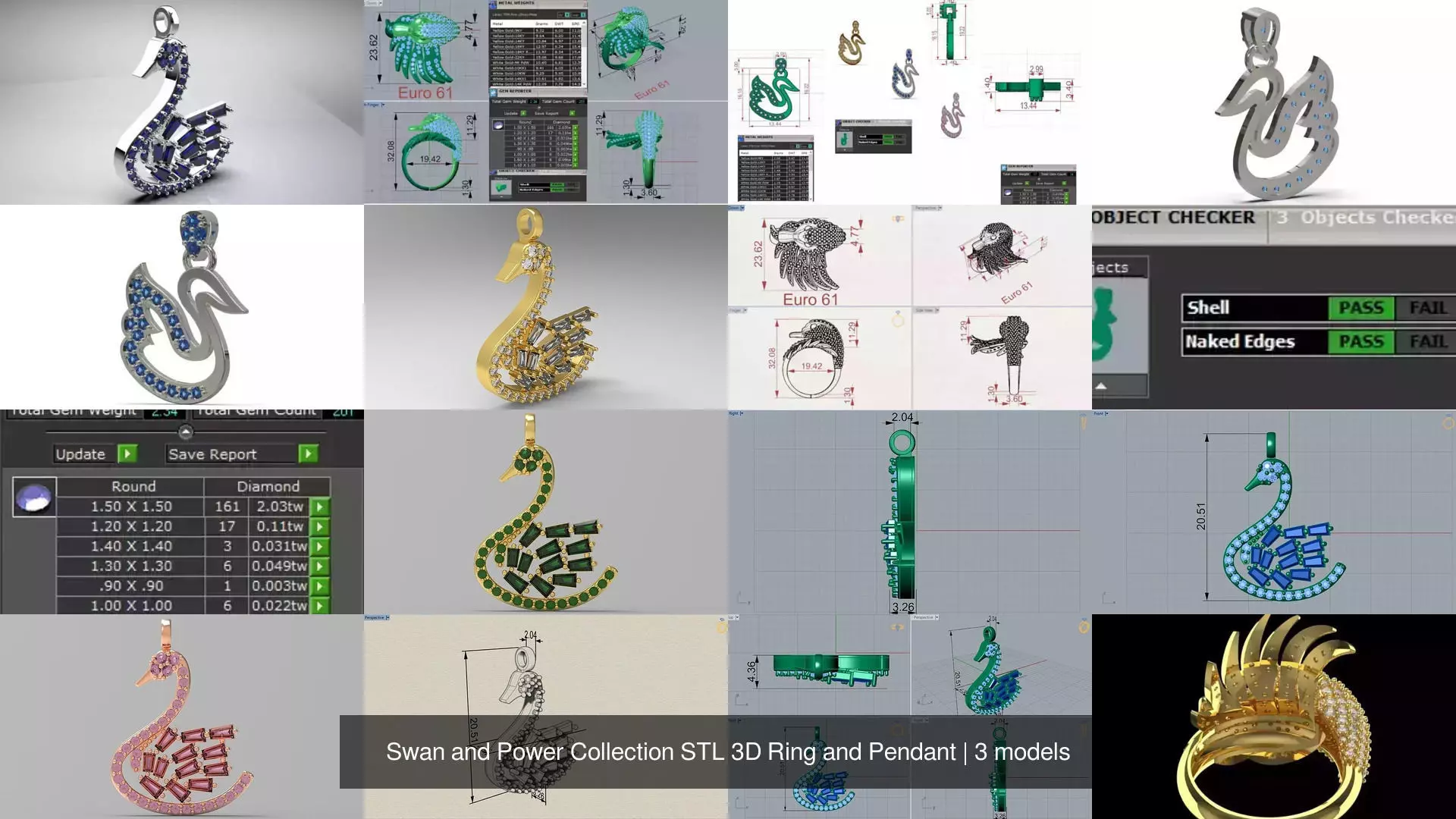 Main package content (3 new designs):File code Product description Jewelry type Main symbol and detailsjp0171 Swan wing pendant Baguette diamond Swan silhouette necklace pendant Gold, feathers with baguette cut diamonds, stoned bodyjp0334 Minimal swan pendant with blue sapphire Silver swan necklace pendant (minimal and curved), body and feathers stoned with sapphire/blue stonejr00194 Swan head swan ring, head and wings fully stoned, solid gold
