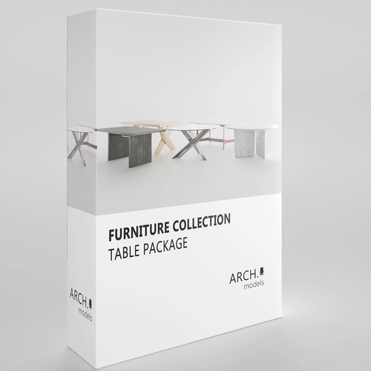 Collection of 5 hilgly detailed modern tables. Package includes:Red base tableWooden Dining table Metal Dining tableMarble Coffe tableWooden Dining table 2 Buying whole collection you save 15$.