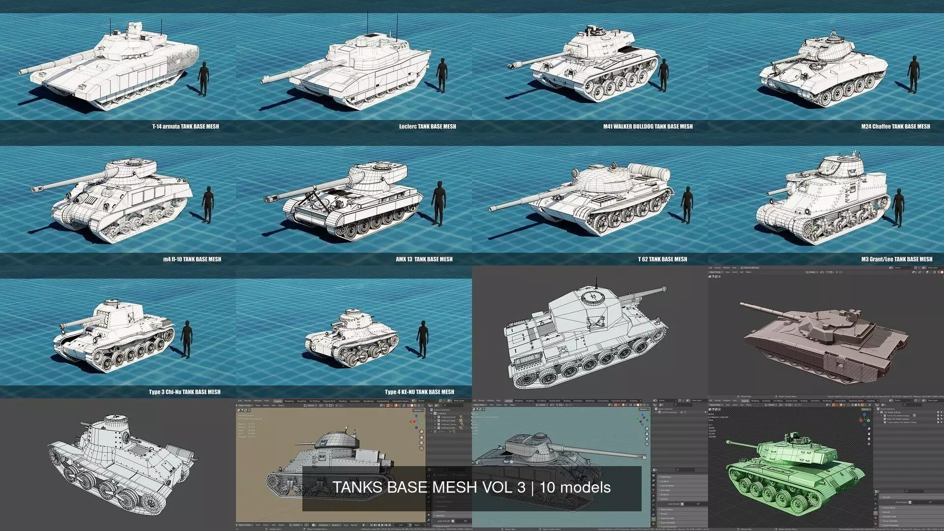 Collection of tanks from different periods. All named with date of production. Tanks are modeled in Blender 3.5 with correct scale in blender units. Topology is low poly and easy to work with. All parts are as separate objects(in blender scene).