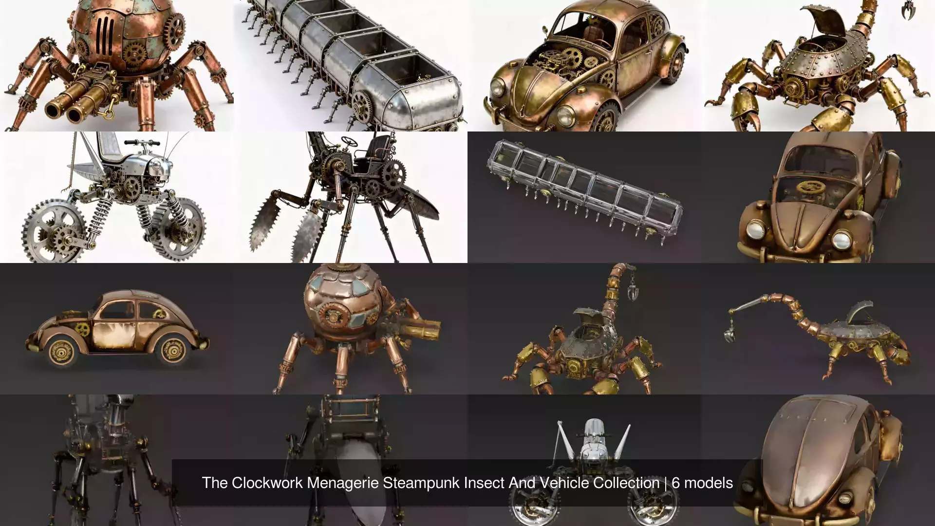 Included ModelsCopper Crawler Steampunk Spider-Tank: A heavy combat unit with multiple legs and a turret-like abdomen, plated in polished copper.
