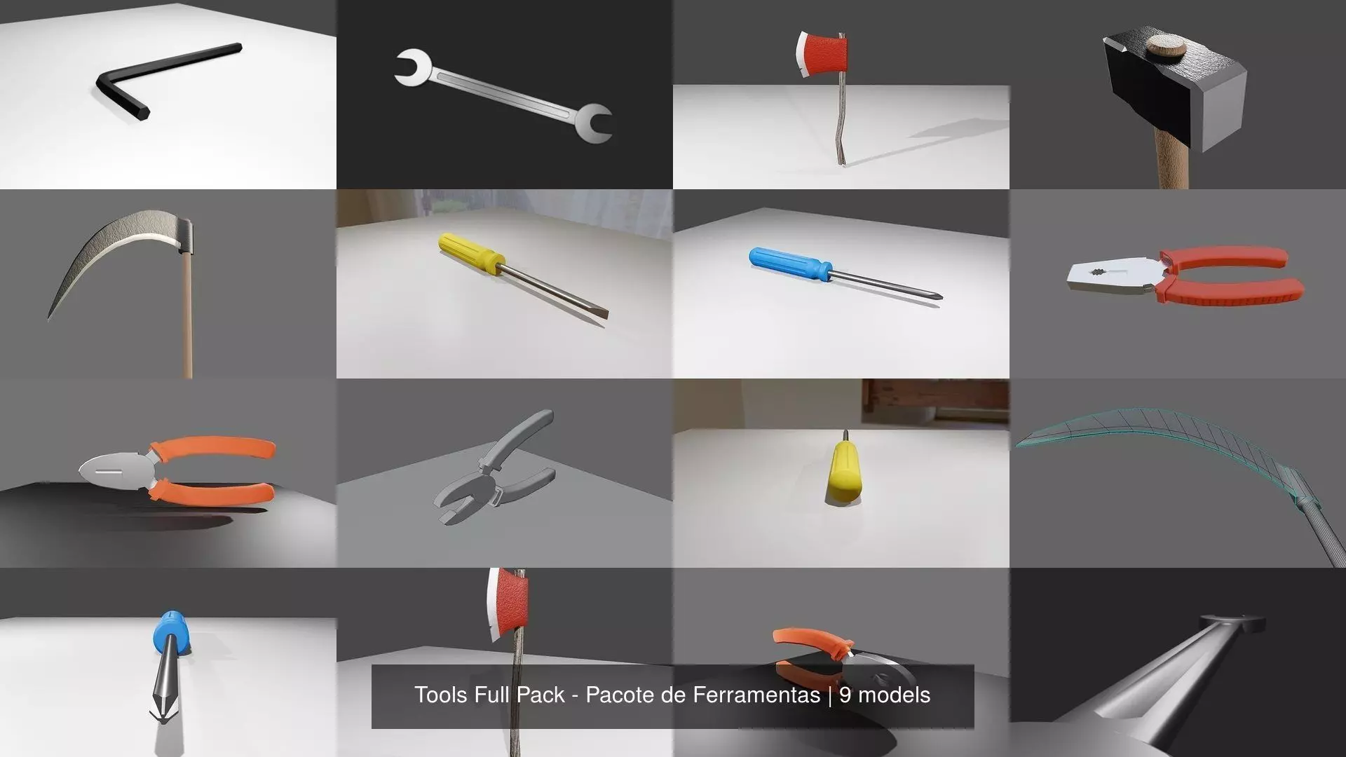 In this Pack you have:PliersCutting PliersScrewdriverPhilips ScrewdriverSpanner WrenchHex KeySledgehammerScytheAxe