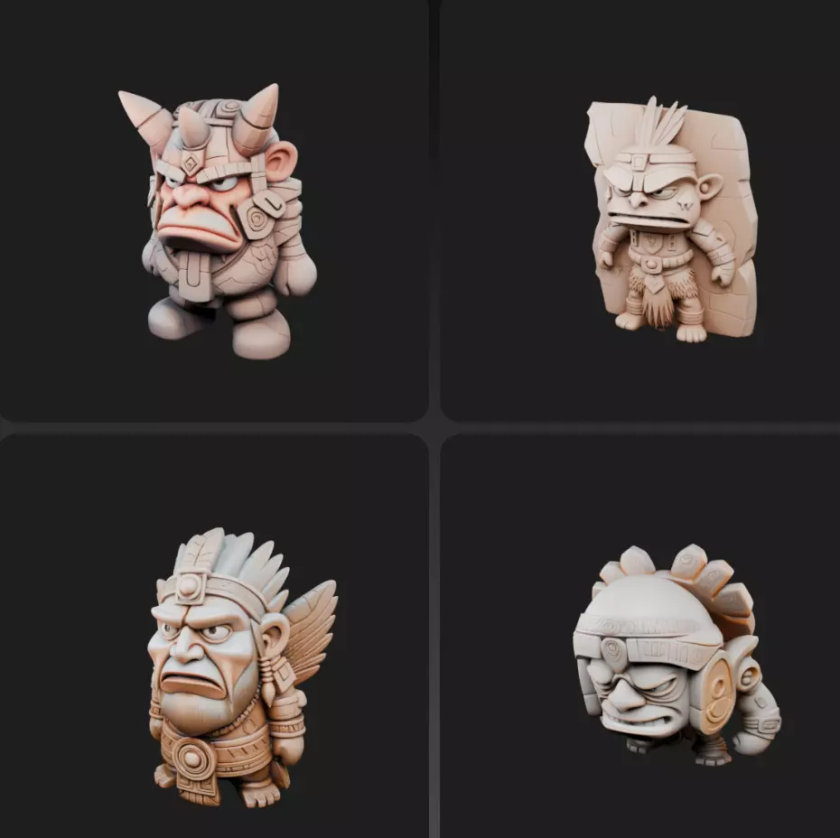 This collection features four unique stylized tribal guardian sculptures, each with its own distinct personality and design. From horned idols to stone wall warriors, winged leaders, and crouching fighters, these models bring ancient protection and mythical power to life.