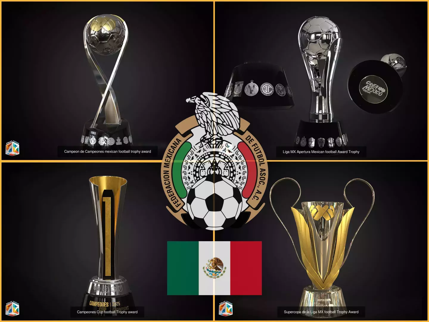 This premium Mexican Football Trophy Bundle 3D Model collection [Este exclusivo Pack de Trofeos de Fútbol Mexicano 3D Model] unites four prestigious football awards into one cinematic package: the Liga MX Apertura Trophy, the Supercopa de la Liga MX Trophy, the Campeones Cup Trophy, and an additional Mexican championship award. Designed with photoreal precision and championship-grade detail, these trophies represent the pinnacle of Mexican football heritage.