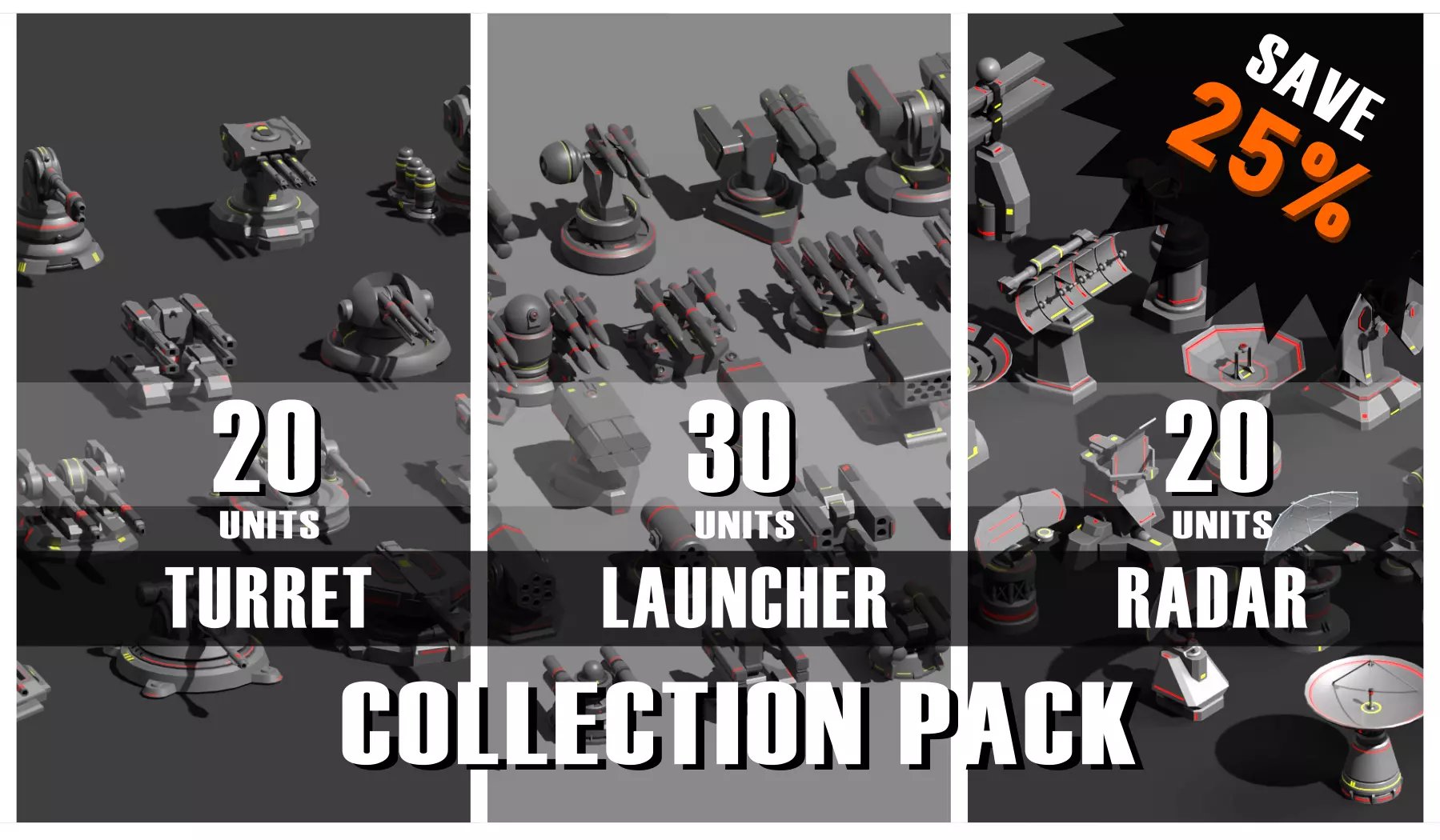 Combo pack of total 70 models of turret, launcher and radar units