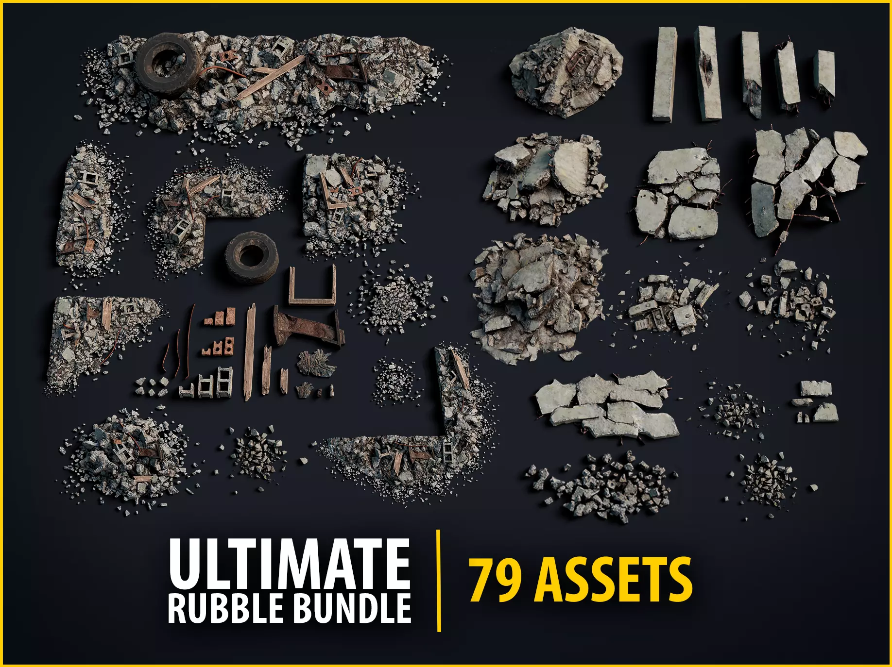 This bundle combines two massive packs to give you 79 high-quality modular concrete rubble and debris assets designed for post-apocalyptic, construction, or destruction scenes. Get the ultimate toolkit for ruined environments: you’ll find pre-assembled composite piles, clean base foundations, broken slabs, blocks, and individual scatter props that can be freely combined to create unique scenes.
