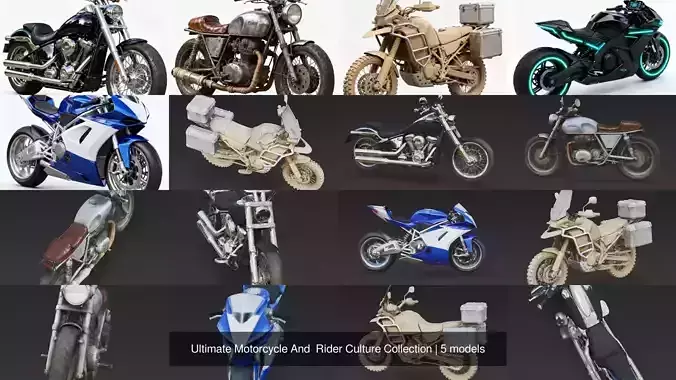 Collection DescriptionIgnite the engine and hit the asphalt with a diverse library of two-wheeled machines that capture the spirit of riding across every era and genre. This collection is the definitive toolkit for vehicle artists and game developers, offering a bike for every type of character and environment. The set is curated to represent the full spectrum of motorcycle culture: