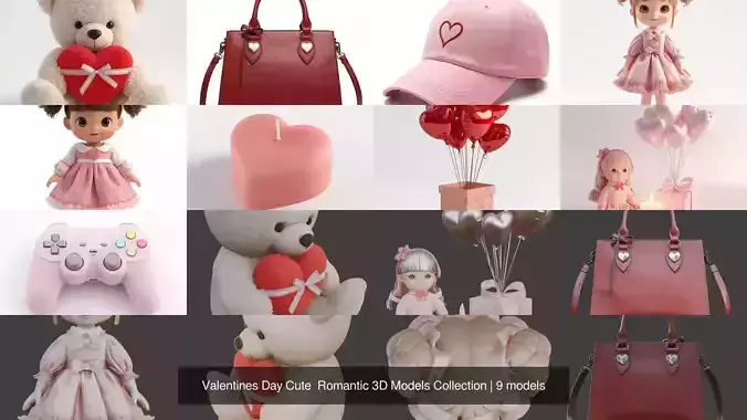 DescriptionA charming Valentine’s Day collection featuring heart-shaped candles, pastel gaming accessories, romantic dolls, teddy bears, handbags, gift boxes, and festive props. Perfect for creating romantic scenes, social media visuals, holiday games, or 3D printed gifts. Each model is crafted with a cute, playful, and pastel-inspired aesthetic, ideal for Valentine-themed projects.
