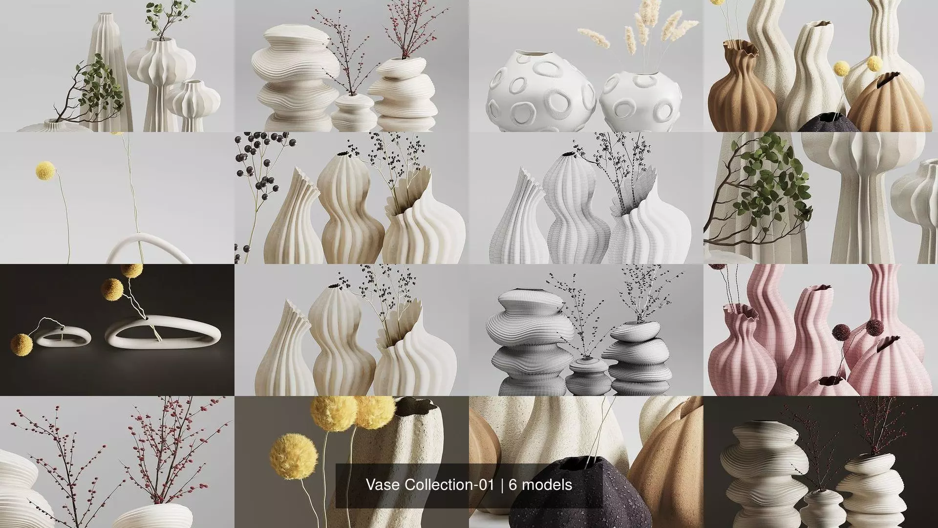 Collection of five different vaseshigh duality materials and detailed enoughh for close up rendering..Vase Set 01-Lithos VasesUnits: centimetersVersion: Max 2014-Corona-VrayPolys: 289.573vertex: 287.550number of Polys and vertexes without plants are as below:Polys: 137.568Vertex: 138.164Product Dimensions in centimeters:Small: 32.4 x 19Squat: 17.8 x 33Talest: 50 x 20Large: 44.5 x 26XForm:YesRender: Corona + vrayFormats: 3Ds Max 2014, obj, fbx.Vase Set 03-Deformed Ceramic VaseUnits: centimetersVersion: Max 2014-Corona-VrayPolys: 447.233vertex: 427.046number of Polys and vertexes without plants are as below:Polys: 179.233Vertex: 179.046Product Height in centimeters:Small: 30Middle: 40Large: 50XForm:YesRender: Corona + vrayFormats: 3Ds Max 2014, obj, fbx.Vase Set 04-FOS FOSSILIA Moonstonehttps://www.fosceramiche.it/portfolio/fossilia/ Units: centimetersVersion: Max 2014-Corona-VrayPolys: 239.269vertex: 495.847number of Polys and vertexes without plants are as below:Polys: 149.053Vertex: 166.987Product Height in centimeters:Small: 26Large: 31XForm:YesRender: Corona + vrayFormats: 3Ds Max 2014, obj, fbx.Vase Set 05-Malene Knudsen CeramicsUnits: centimetersVersion: Max 2014-Corona-VrayPolys: 216.348vertex: 343.790number of Polys and vertexes without plants are as below:Polys: 91.008Vertex: 91.020Product Height in centimeters:16,24,37,42,52,52XForm:YesRender: Corona + vrayFormats: 3Ds Max 2014, obj, fbx.Plant Set 01-Dried Plant in Stem Holder Units: centimeters Version: Max 2014-Corona-VrayPolys: 83,034 vertex: 159,118Product Dimensions in centimeters: Big Set: 55 x 25 Small Set: 39 x 18 . XForm:YesRender: Corona + vray Formats: 3Ds Max 2014, obj, fbx