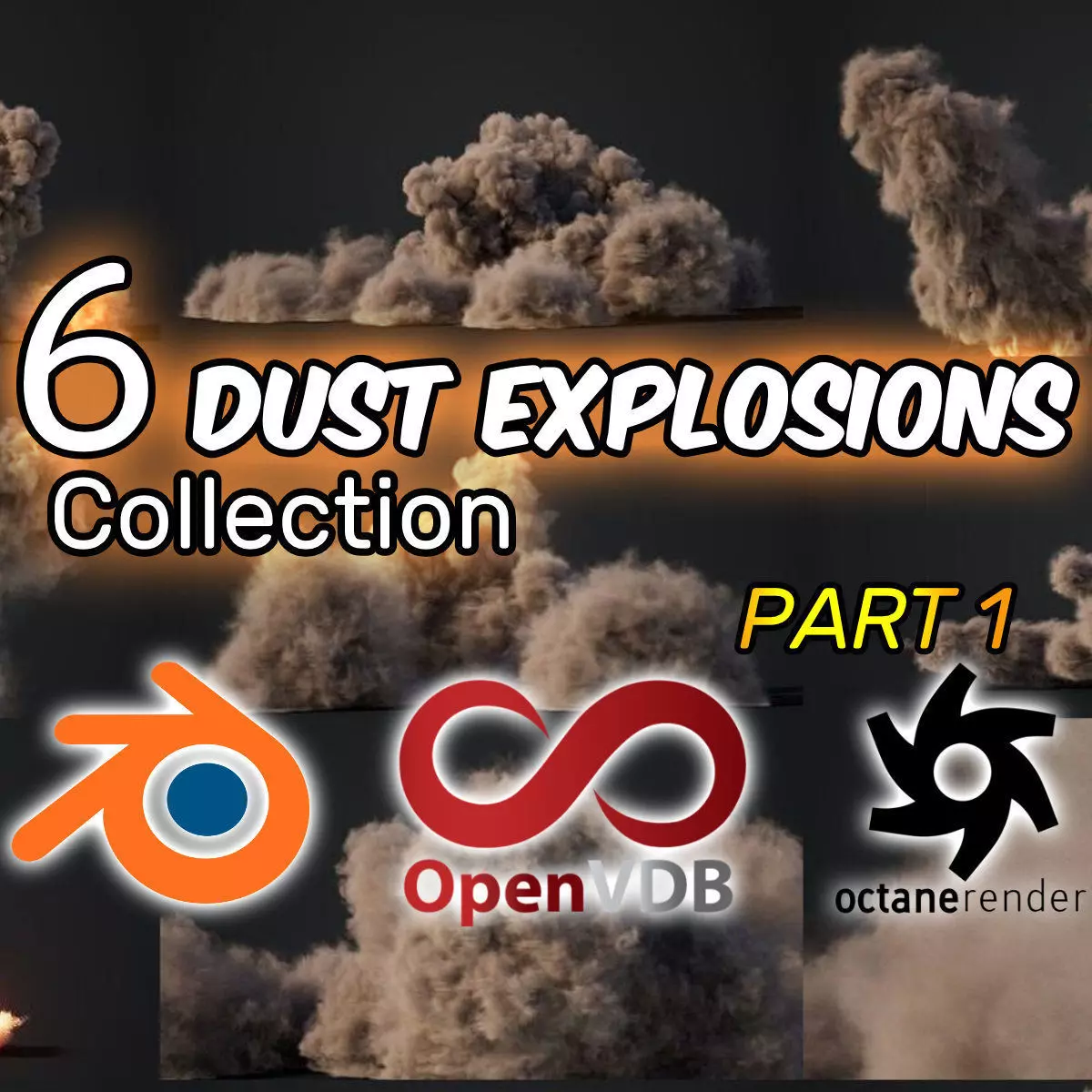 A Collection of 6 VDB Product of Animated Dust ExplosionsNo simulation needed!, just import and layout into your scene!