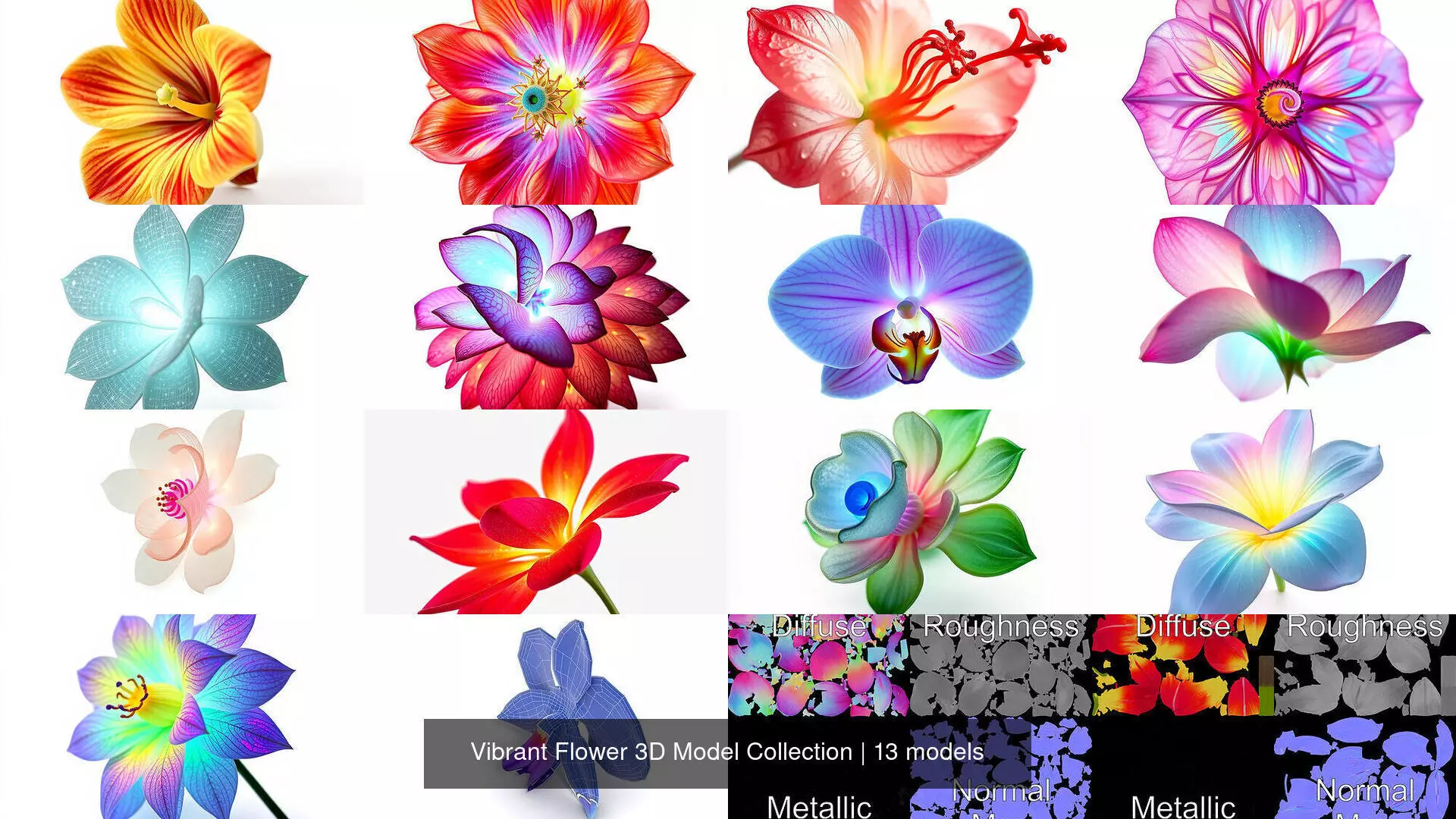 Explore a captivating collection of vibrant and versatile 3D flower models, perfect for digital art enthusiasts and professionals alike. This pack features intricately designed models such as the Rainbow Flower, Iridescent Flower, Orchids, and realistic Hibiscus, bringing your creative projects to life. Ideal for D applications and rendering, these models display striking details from the vibrant Lotus to glowing blooms suitable for environment design and animation projects.