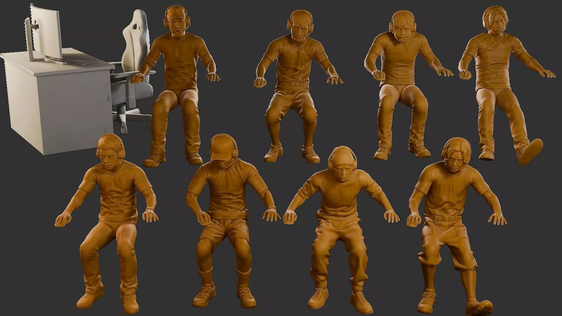Casual Male Video game player model in action with a variety of objects. Ideal for your dioramas.The miniatures represents a casual male Video game player in an event contest, ideal for gamer setups, esports scenes, and lifestyle dioramas.Perfect 3D printable high quality miniature for collectors, creators, and hobbyists looking for human figures STL, gamer models, and diorama miniatures.