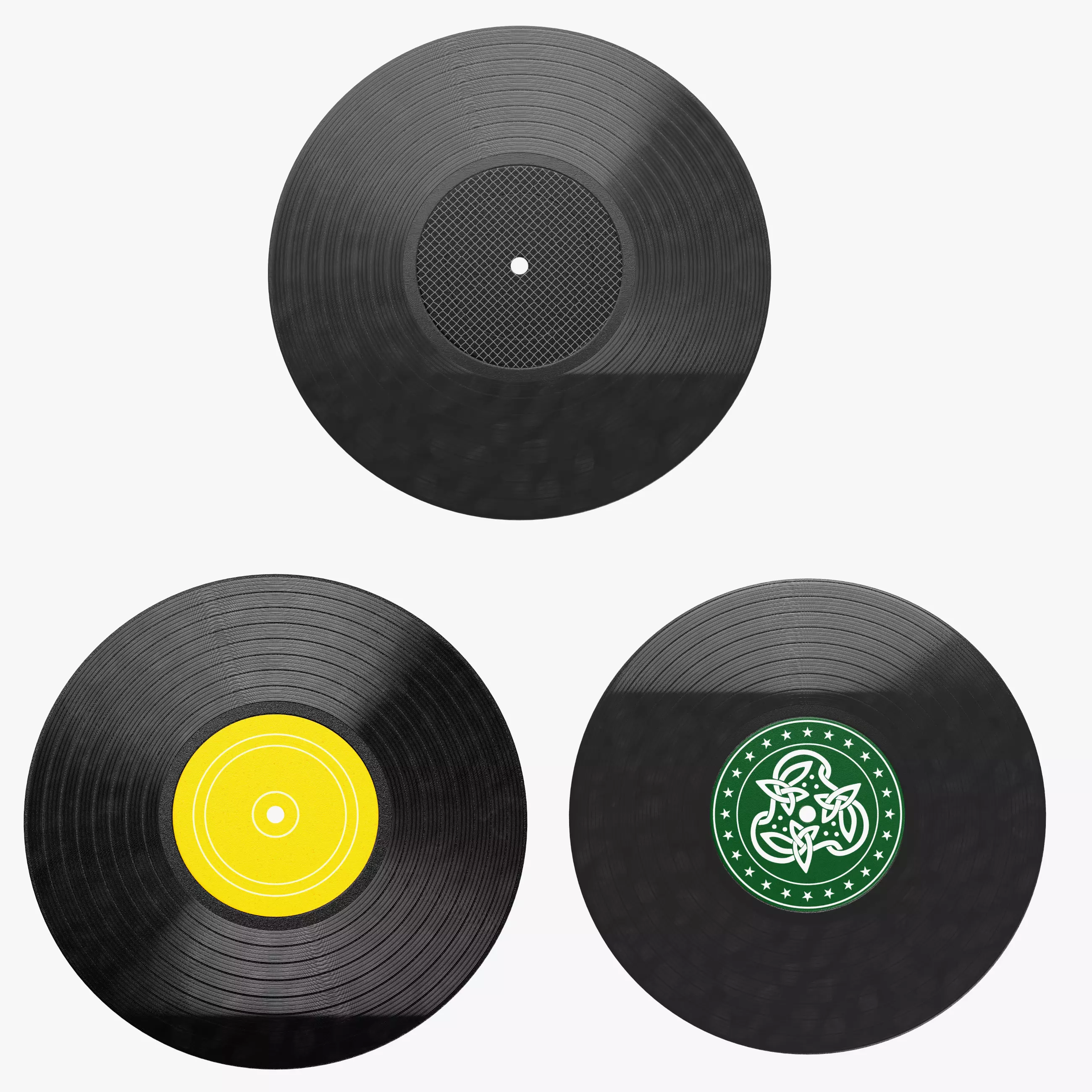 A high-quality collection of three classic vinyl records, capturing the iconic aesthetic of analog music media. This set focuses on material authenticity, featuring detailed spiral groove textures and realistic light reflections characteristic of PVC discs. The collection includes three distinct variants: a minimalist all-black disc with a textured center, a version with a blank yellow paper label for easy customization, and a version featuring a stylized green graphic label. Designed as non-branded assets, these models are perfect for music-themed environments, vintage interior renders, or retail visualizations where credibility and detail are key.