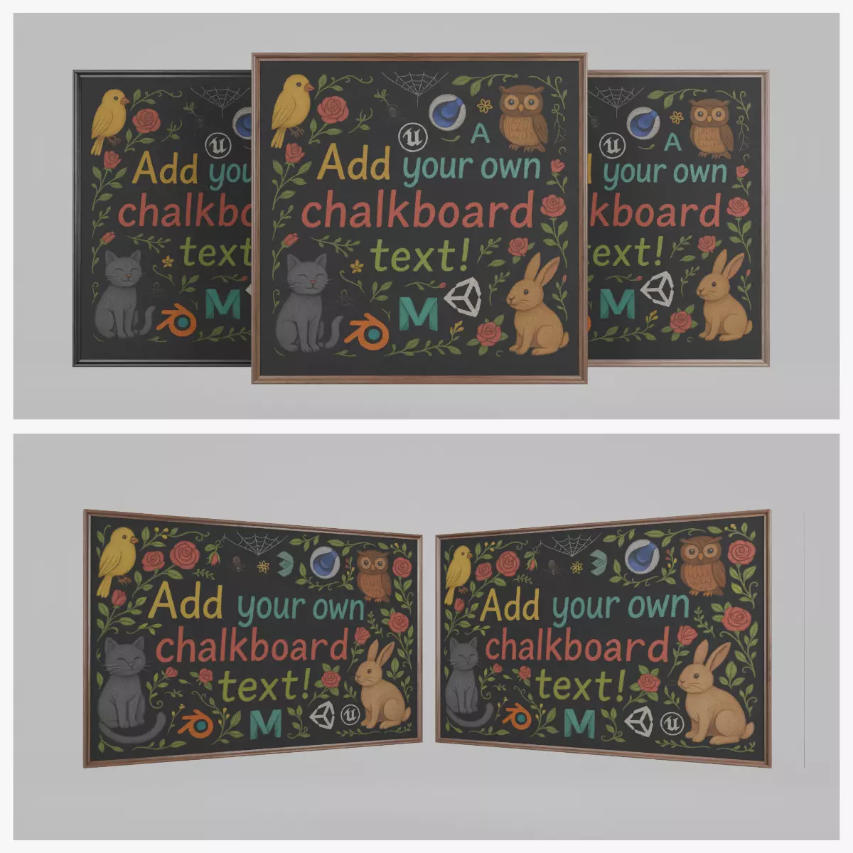 A versatile set of high-quality 3D wall-mounted blackboard assets, featuring two models, rectangular and square blackboards with ogee wooden frame style. Perfect for virtual classrooms, architectural visualizations, game environments, and commercial scenes.