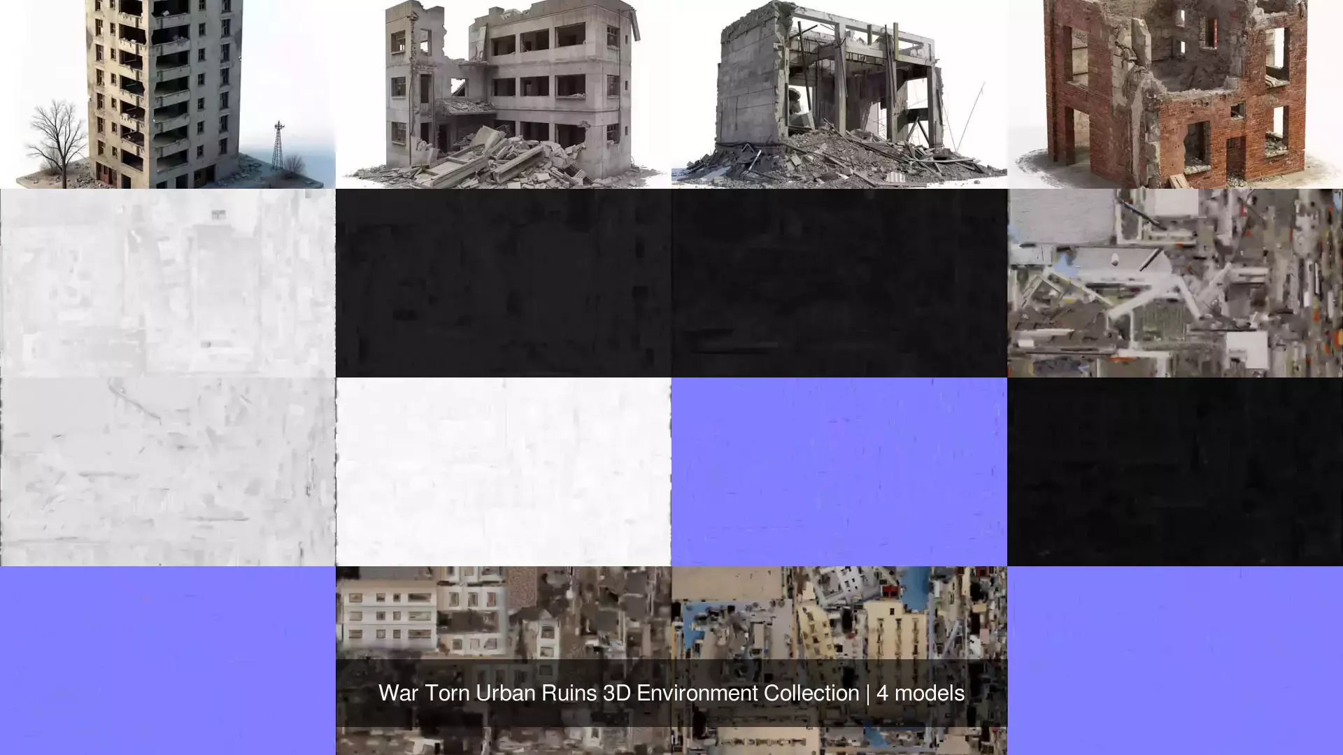 A realistic collection of abandoned and destroyed urban buildings, inspired by war-torn Middle Eastern and industrial environments.This pack focuses on structural damage, exposed concrete, collapsed walls, and weathered surfaces, making it ideal for creating believable post-conflict, dystopian, or disaster-stricken scenes.Included ModelsAbandoned Middle Eastern Red Brick Building RuinDestroyed Industrial Building – Concrete ShellLow Rise Destroyed Building – Concrete RuinWar Torn Apartment Building – Urban RuinCollection TagsAbandoned, Ruins, WarTorn, Destroyed, Urban, Building, Architecture, Concrete, Brick, Industrial, MiddleEastern, PostApocalyptic, Dystopian, Military, Battlefield, Environment, LevelDesign, GameAsset, 3DModel, PBR, LowPoly, Realistic, Cinematic