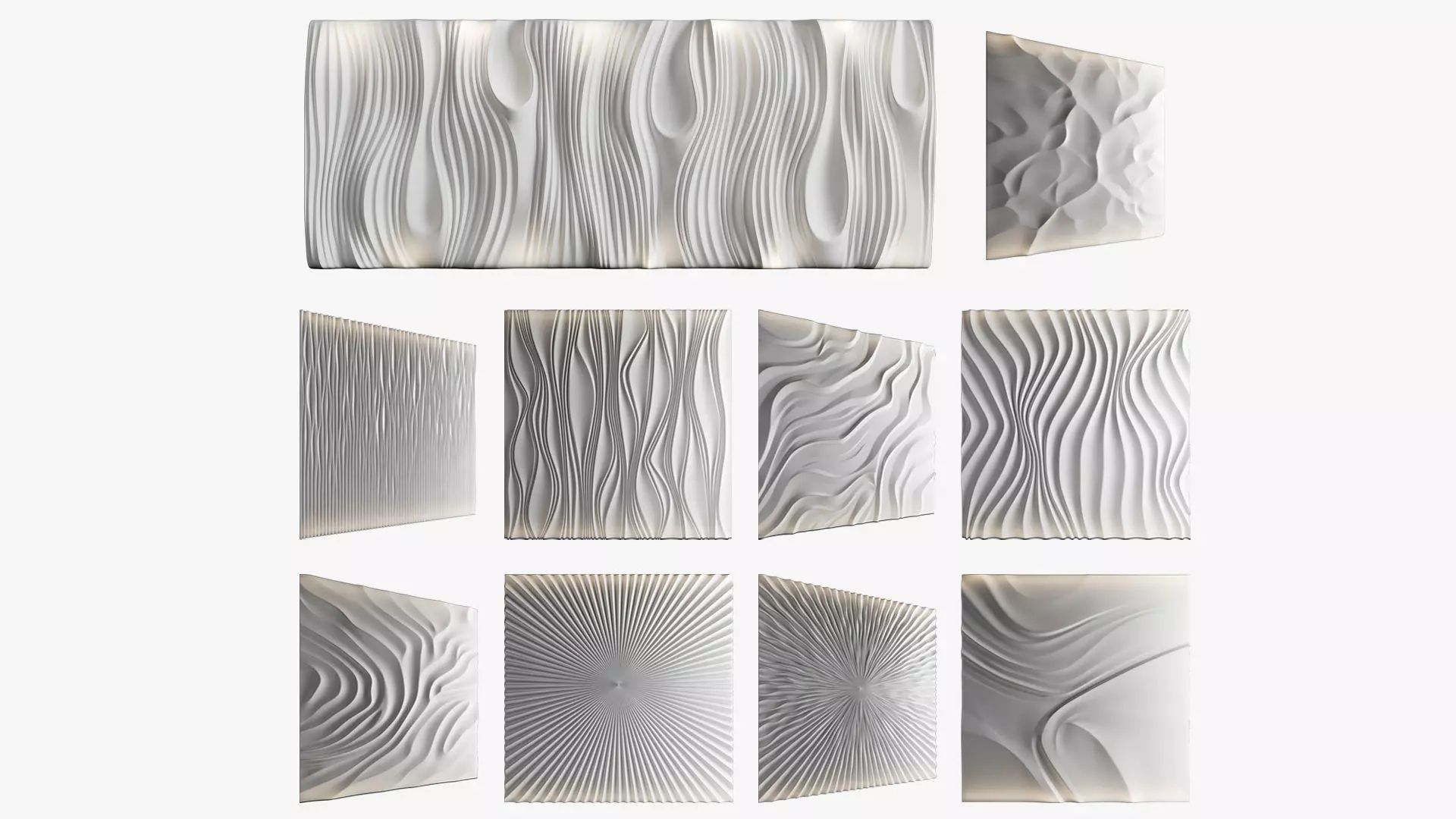 This collection includes decorative wavy walls that can be used both indoors and outdoors. The typical dimensions are 3 meters by 3 meters with a thickness of 5 to 7 centimeters.