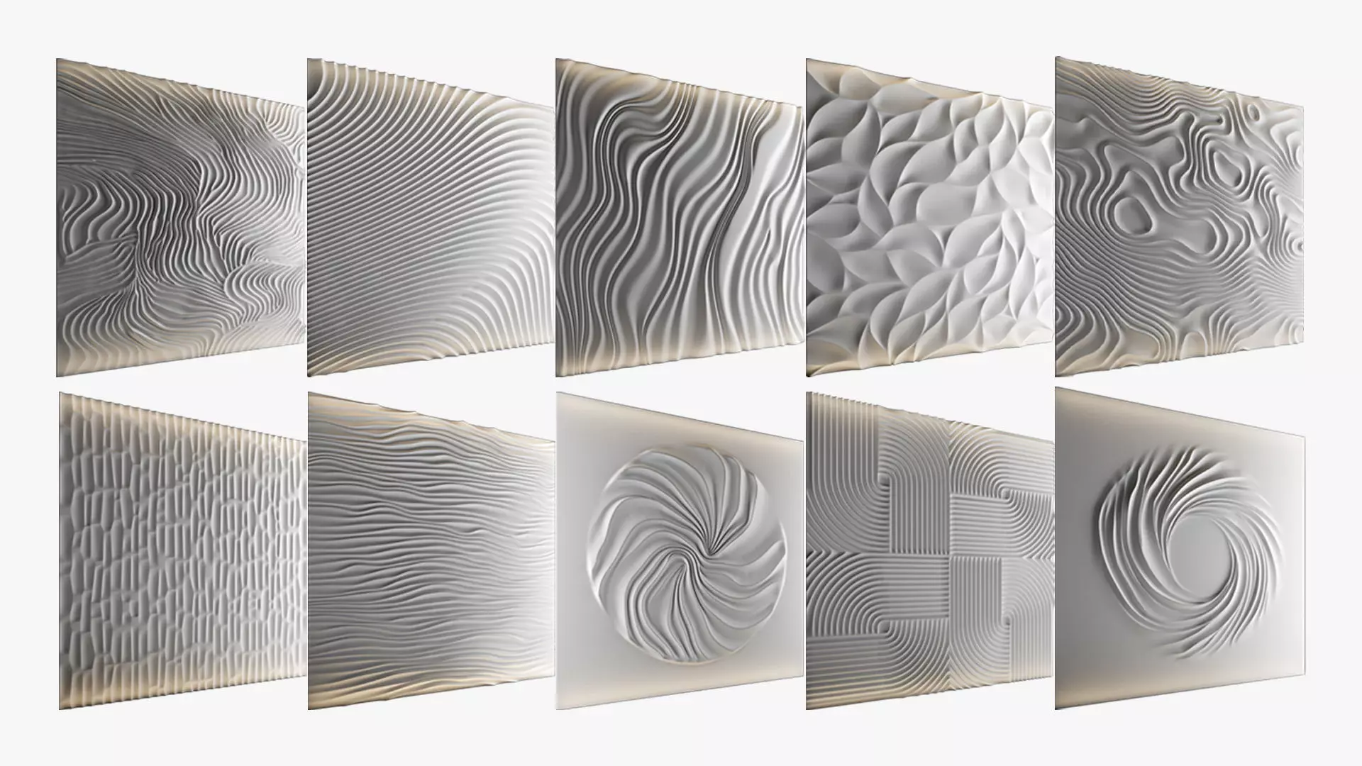 This collection includes decorative wavy walls that can be used both indoors and outdoors. The typical dimensions are 3 meters by 3 meters with a thickness of 5 to 7 centimeters.