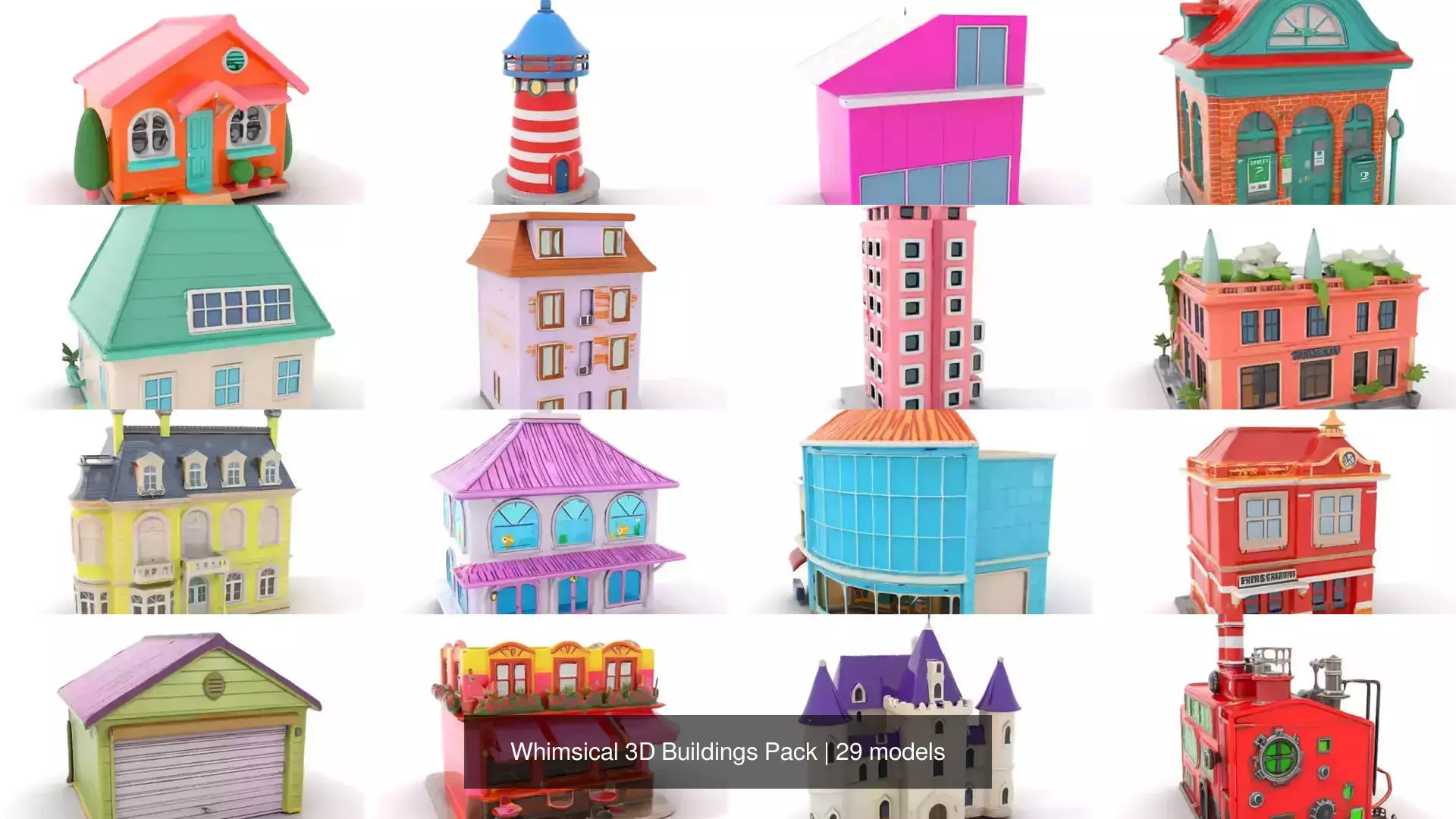 Dive into a world of creativity and color with the Whimsical 3D Buildings Pack. This collection features an array of vibrant and playful cartoon-style structures, each meticulously crafted to capture the charm and fantasy of animated designs. From the cartoon cottage with its lemon yellow walls and chocolate brown roof, to the lively cartoon restaurant adorned with a rainbow-colored facade and a carnation pink rooftop, these models bring an animated essence to life. The striking cartoon skyscraper with a pastel pink exterior and glistening silver roof towers with whimsy, while the radiant red and white striped lighthouse exudes nautical charm. This collection showcases a variety of textures, capturing the playful nature of cartoon architecture, ensuring a fun and engaging 3D experience.