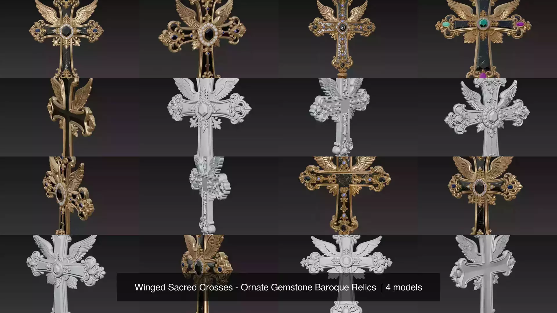 This exclusive collection includes four high-detail Winged Sacred Cross sculptures, each designed with a unique combination of angelic wings, gemstone ornaments, baroque gold filigree, and sacred relic aesthetics.Ideal for fantasy environments, cathedral interiors, holy artifacts, decorative sets, and premium 3D print creations.