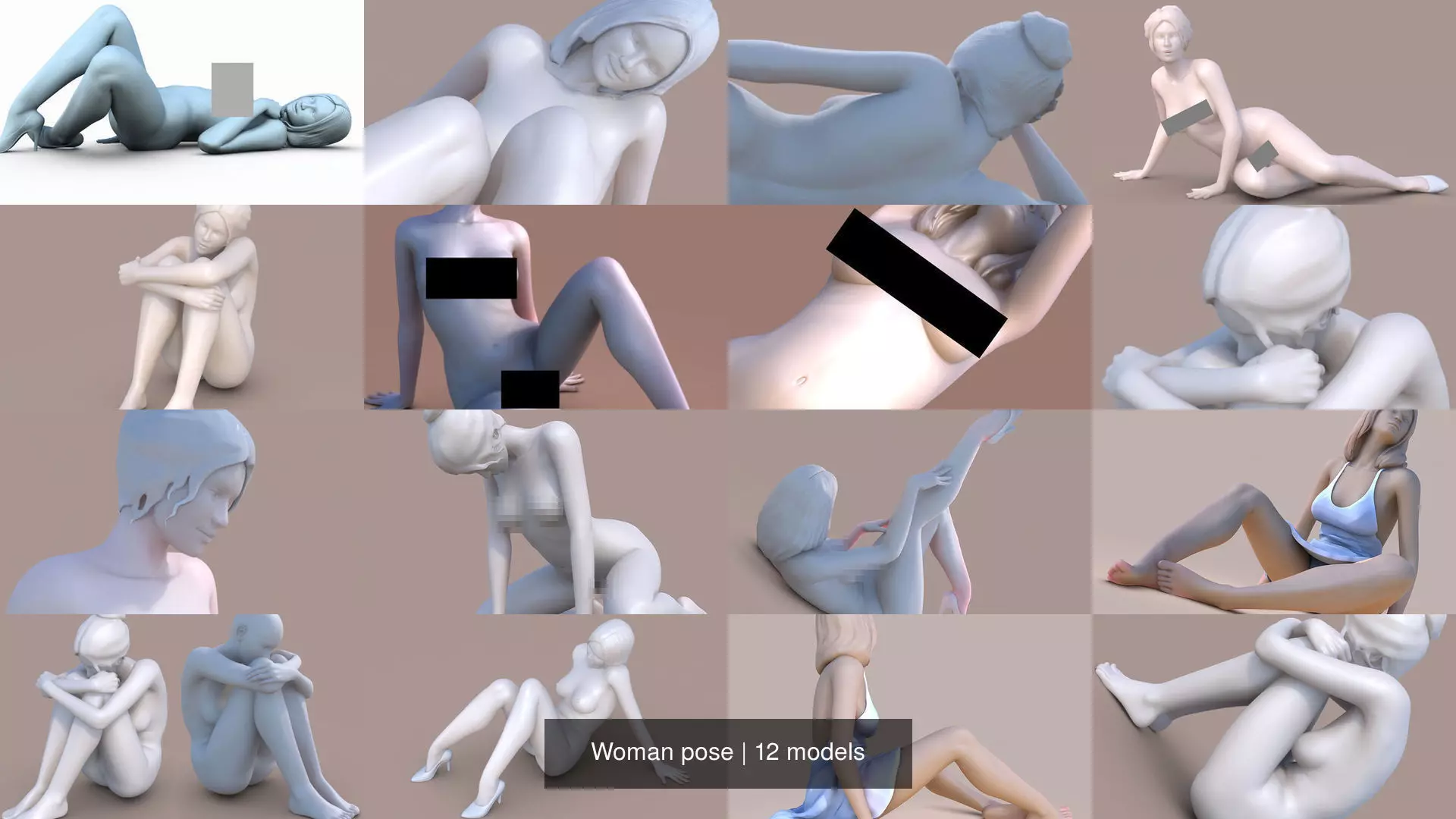 A collection of 12 nude female models in different poses ready for 3d print