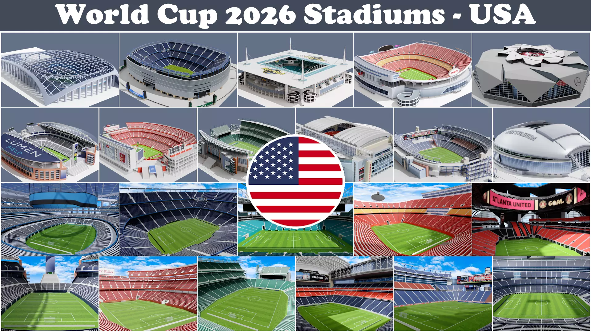 11 stadiums-Lumen Field-Levi's Stadium-SoFi Stadium-Arrowhead Stadium-At&t Stadium-Mercedes Benz Stadium-NRG Stadium-Gillette Stadium-Lincoln Financial Field-Hard Rock Stadium-MetLife Stadium