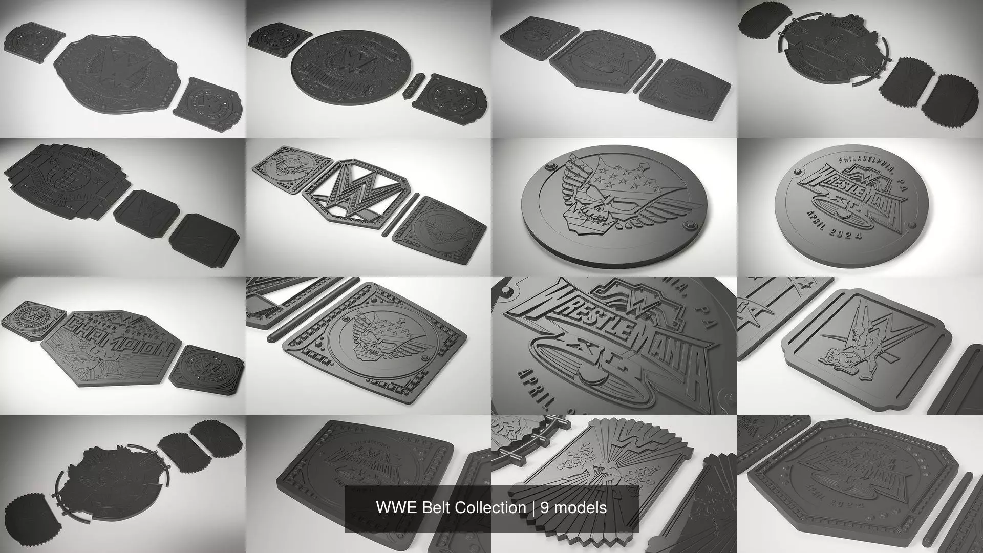 The collection of 9 WWE Belts for 3D Print. STL checked and passed in 3ds Max. STL file loaded into Cura and sliced ok.