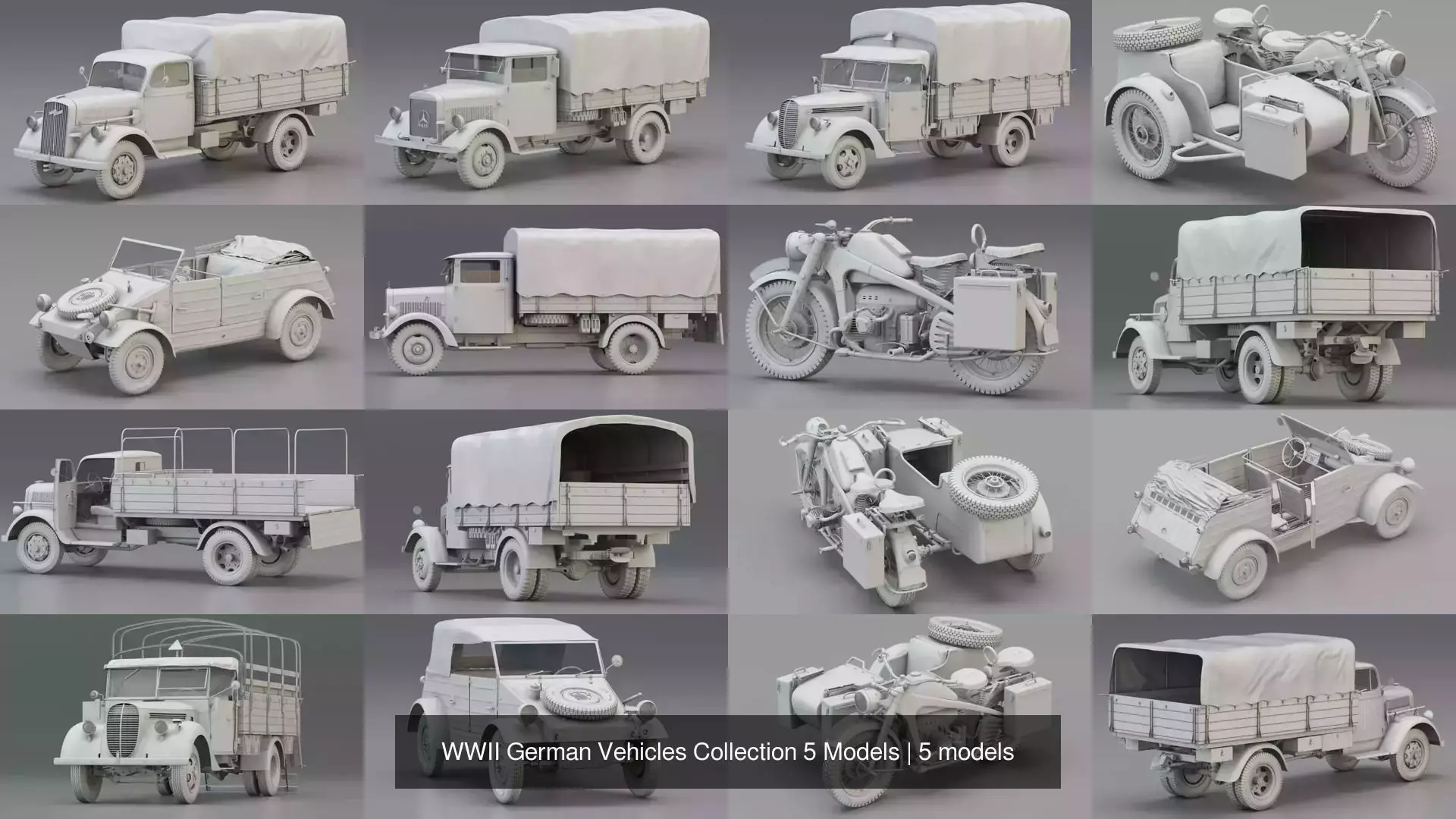From the iconic 3-ton cargo trucks to light utility and reconnaissance vehicles – this pack covers the most versatile transport options of the era.