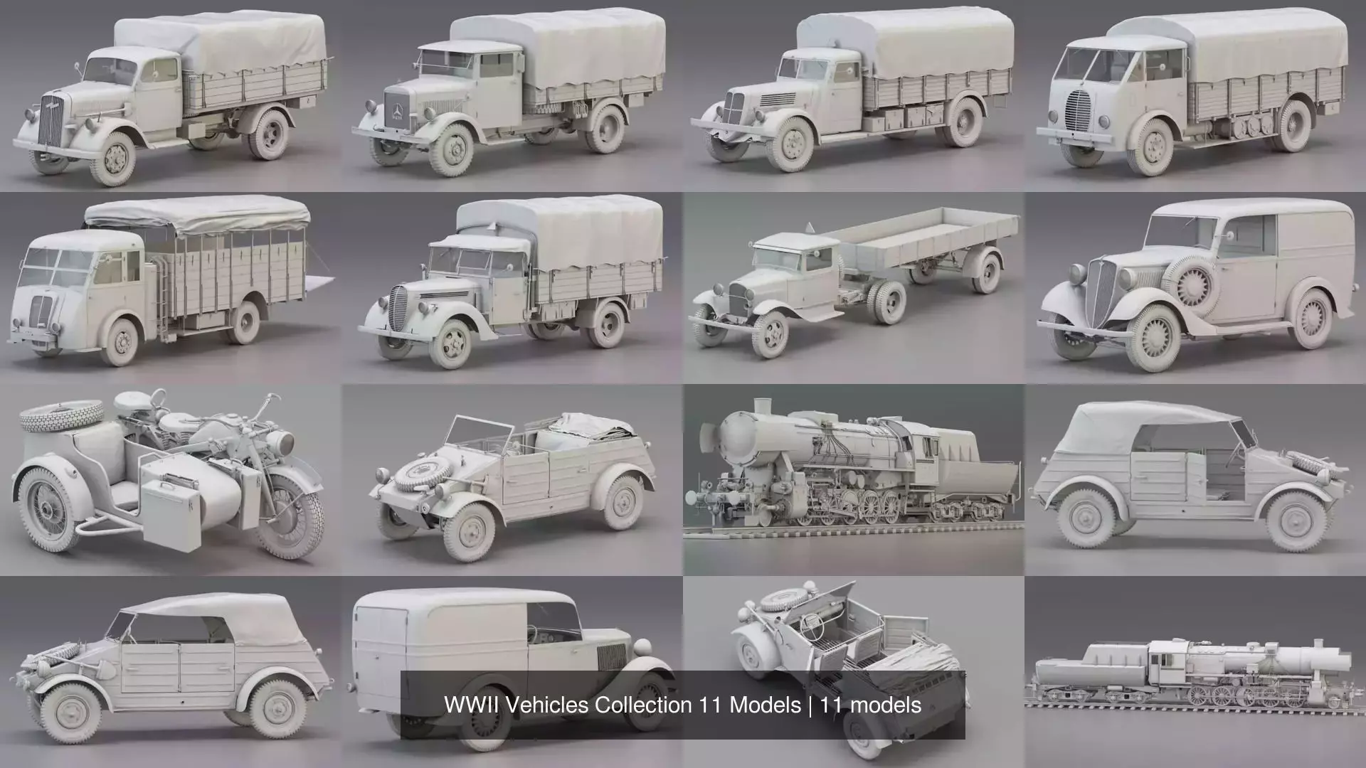 From utility cars and motorcycles to heavy trucks and a steam locomotive – the full set is here for your project.