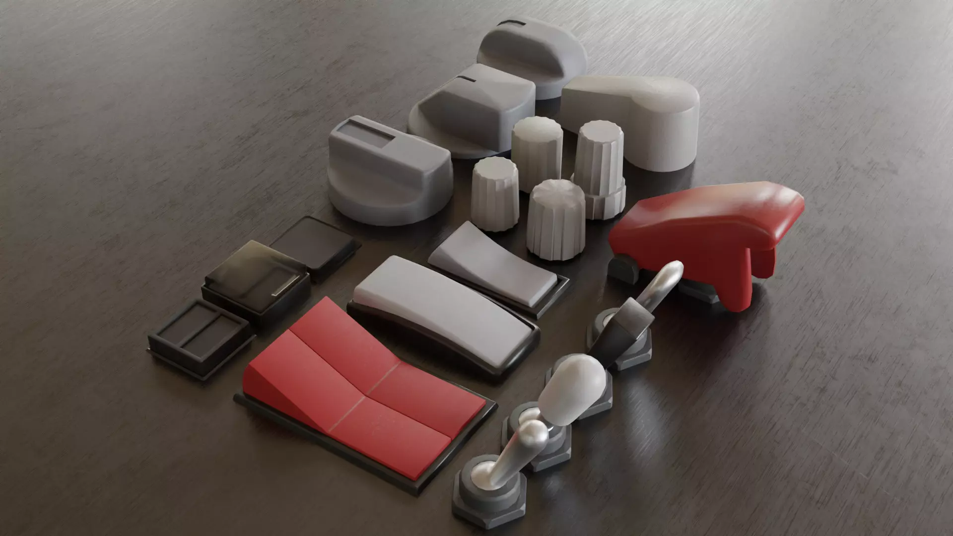 Simple low-poly buttons, switches and knobs for airplane cockpit.Every button, switch, knob has a 512x512 texture
