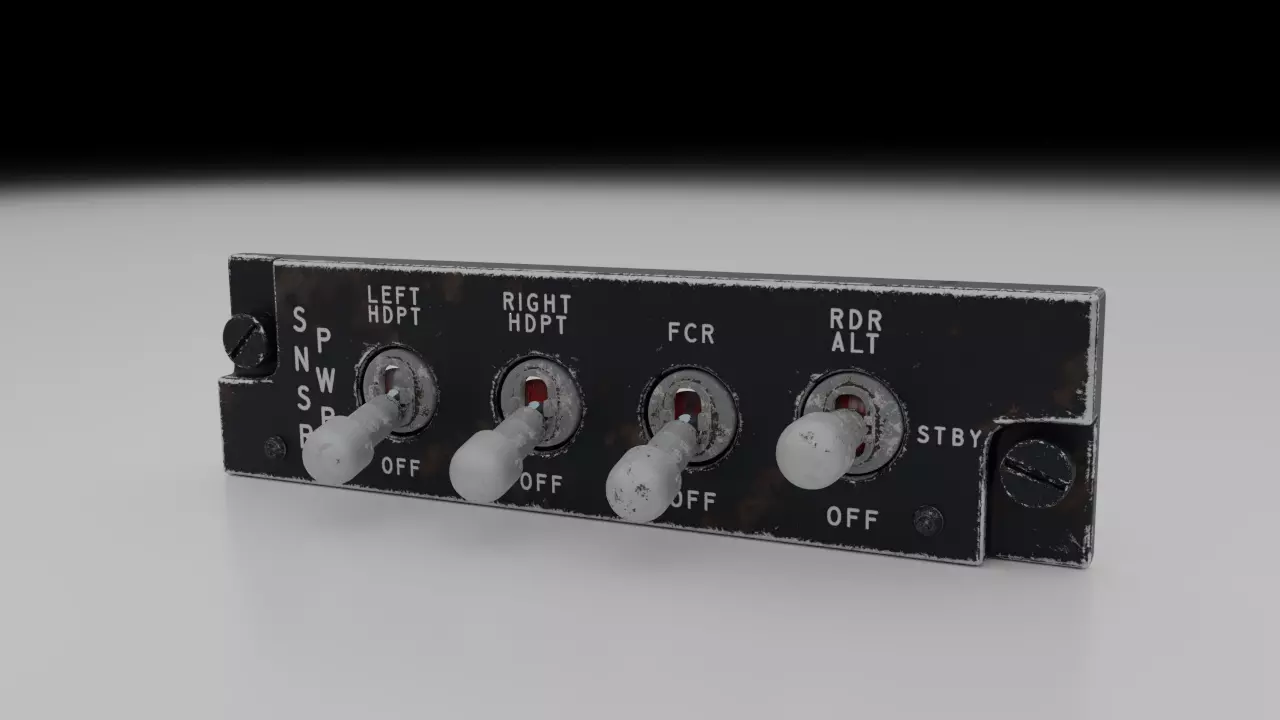 The panel is comprised of 4 toggle switches, 3 of them are a 2-way switch and one 3-way switch. Their function is to power On/Off the left and right fuselage hardpoints (normally targetung or navigation pods), also to power the Fire Control Radar System (FCR) and lastly the radar altimeter (RDR ALT).