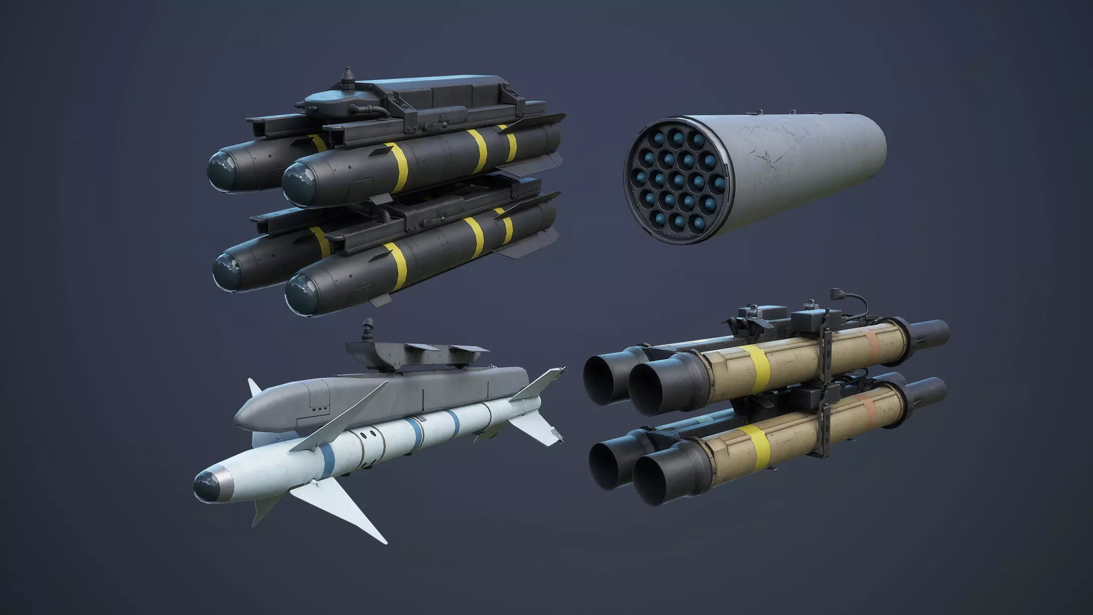Collection of low-poly 3d-models of a military aircraft missiles. Set included 4 types of weapons: AGM-114 Hellfire, AIM-9 Sidewinder, Hydra 70 (with LAU-61 and LAU-68) and TOW BGM-71 with XM65 Launcher.