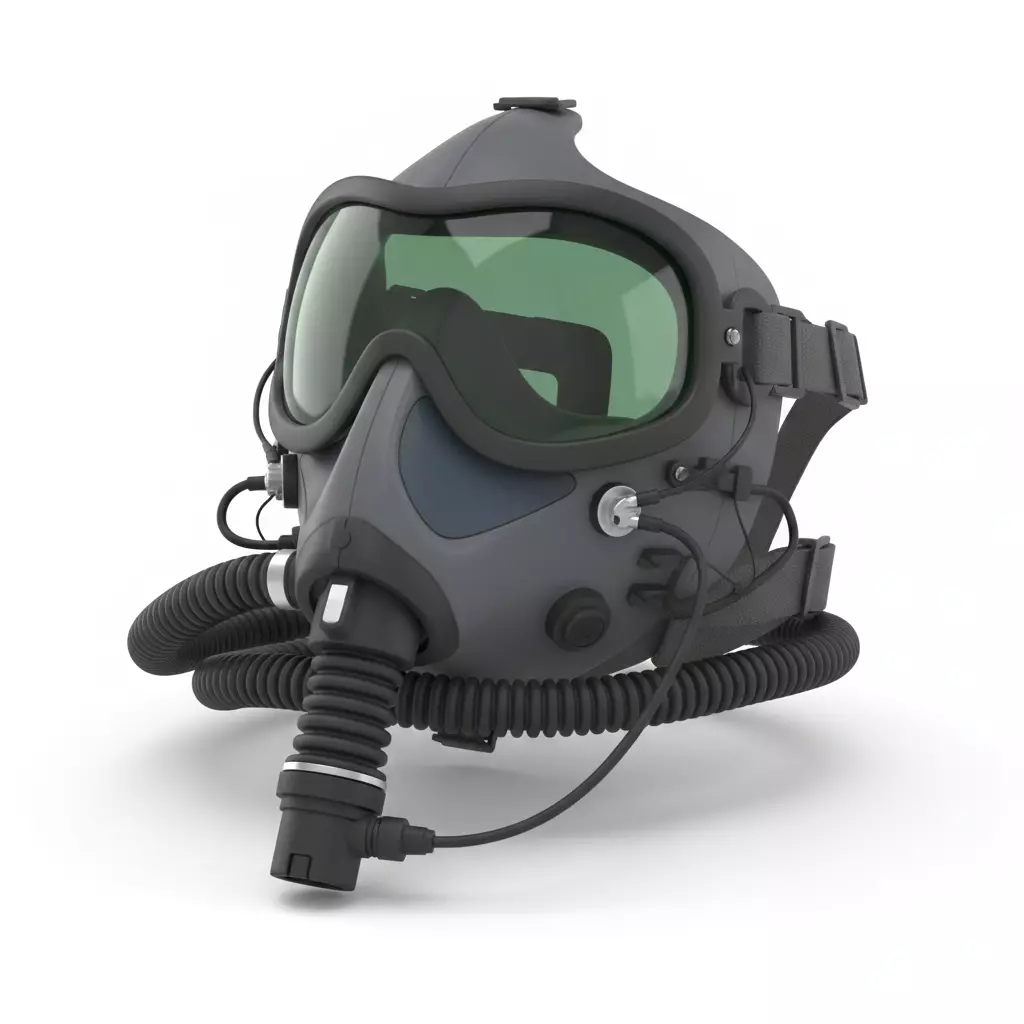 This precise 3D model represents a modern tactical oxygen mask designed for high-altitude jet pilots and military aviators. The model features a matte charcoal-grey silicone face seal integrated with a wide-view green-tinted visor for superior situational awareness. It is equipped with a comprehensive life support interface, including a flexible, corrugated main breathing hose and secondary communication or sensor cables with metallic connectors. The design includes adjustable nylon webbing straps for a secure fit and a streamlined profile intended to interface seamlessly with standard flight helmets. With its high-quality textures and realistic mechanical details, this asset is an excellent choice for flight simulations, cinematic character renders, or technical visualizations of aerospace life-support systems.