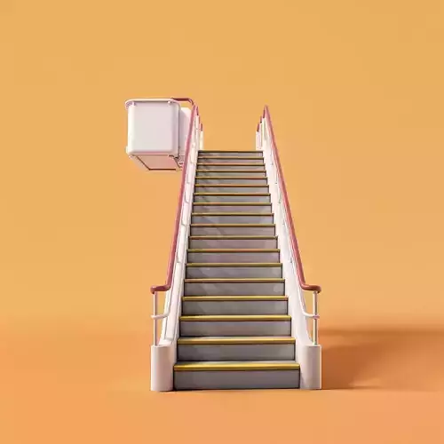 A sleek, modern rendering of a mobile airport staircase is shown from a head-on, low-angle perspective. The staircase, set against a solid orange background, features a clean, minimalist design with a white body, gray steps, and yellow safety strips. The railings have a prominent pinkish-red handrail, which adds a subtle pop of color and a modern touch. A small, white utility box is attached to the upper side of the stairs. The image has a sterile, artistic quality, with a shadow visible beneath the stairs on the orange ground. The composition is simple and highlights the elegant design of the object.