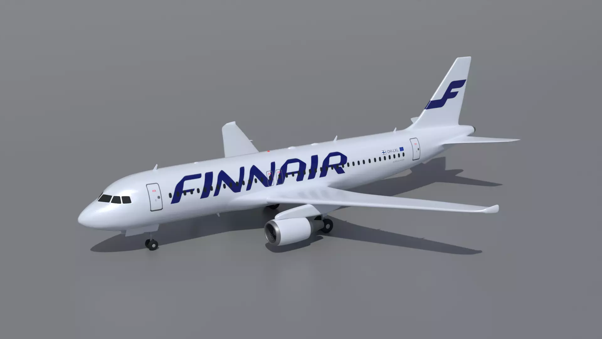 This is a realistic 3D model of a commercial Finnair airbus a320 airplane jet. The airplane was modeled and prepared for realistic renderings, background, general CG visualization presented as 1 mesh with quads.