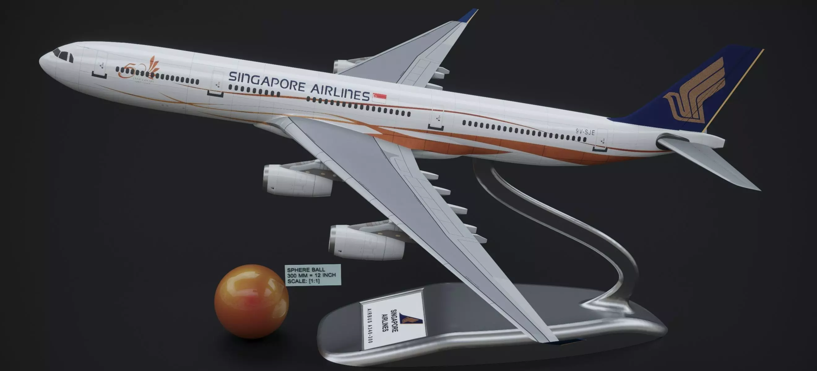 PRODUCT BRIEF DESCRIPTION: "This is a replica model of a 1/200 th scale aircraft model of Airbus A340-300 sporting Singapore Airlines 50th Anniversary Livery.