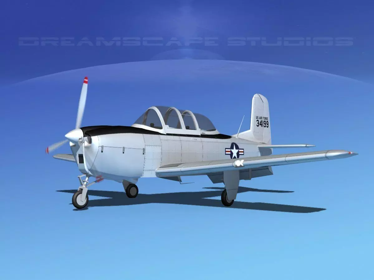 Beechcraft T-34 Mentor V01 USAF This model was originally built in Max 7 in 2006. It is near to scale (within 3-4% of scale) and fully textured. It has been updated using Max 11 in 2017 with high quality smoother mesh, more detail, better cockpits, better textures and higher quality diffuse mapping. 95 percent of all the mesh has been replaced or heavily modified. It comes with all the materials and textures shown in renderings here. It is available in several formats for a wide variety of end users. This model comes with many different liveries. It is built to be used in in-flight or airport ground animations and video or simulation. It can also be used to populate an airport scene. The model has animated propeller. It also has animateable ailerons, flaps, rudder, and elevators. The cockpit is semi detailed including control yokes grips engine controls rudder pedals seating and instrument panel. This model also has animated control surfaces including ailerons, elevators, rudder and flaps. These are animated through their nominal range of motion. In addition the propeller is animated at idle speed.
