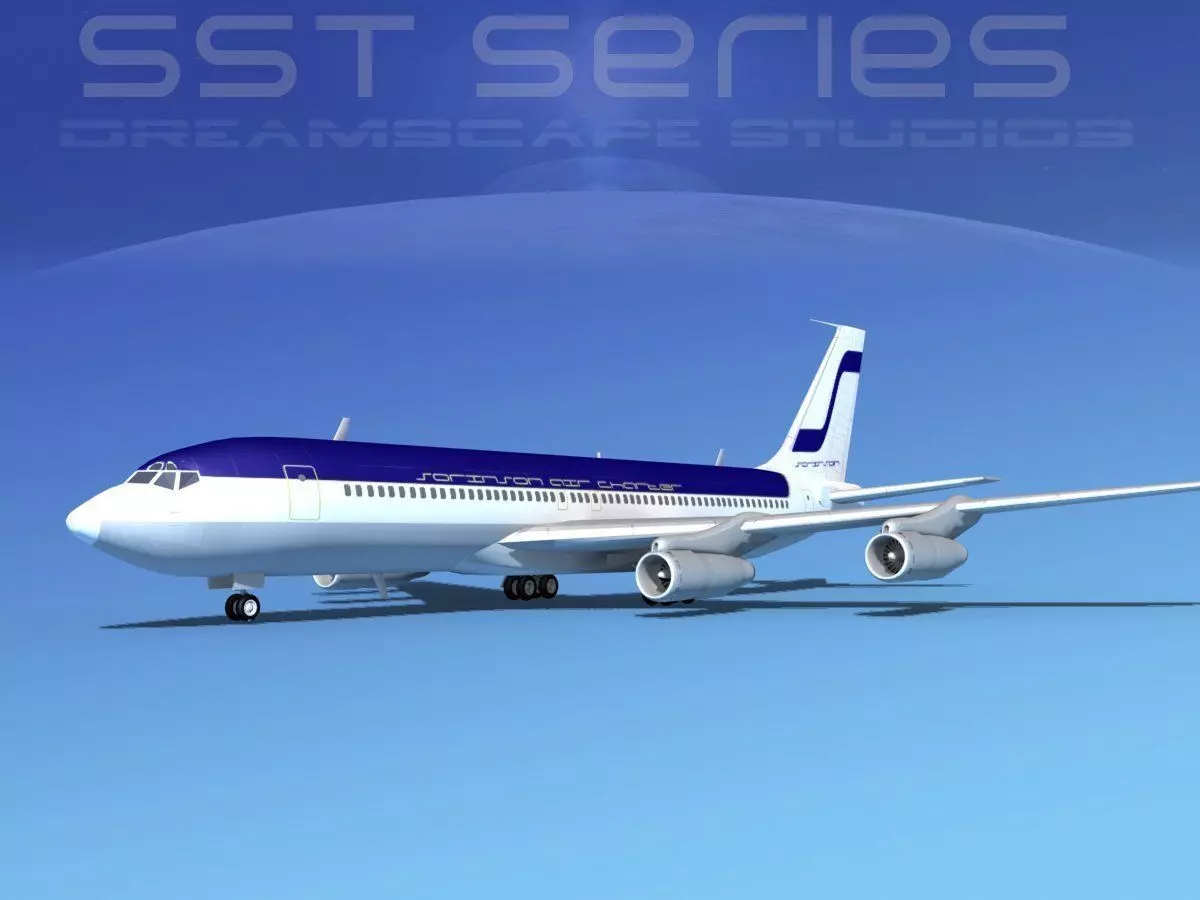 This Boeing 707-320 is built near to scale within a few percent of actual general dimensions. This medium poly model includes smooth exterior with some detail and a realistic rendering appearance. It is built with single sheet textures with a 2000x 2000 resolution. It also has landing gear that can be “turned off or hidden” for inflight animation. This model doe not have the animateable control surfaces of our non-sst model. This is the first model Dreamscape has produced with both single sheet textures and a full complement of liveries giving the user a wide variety of models to choose from.