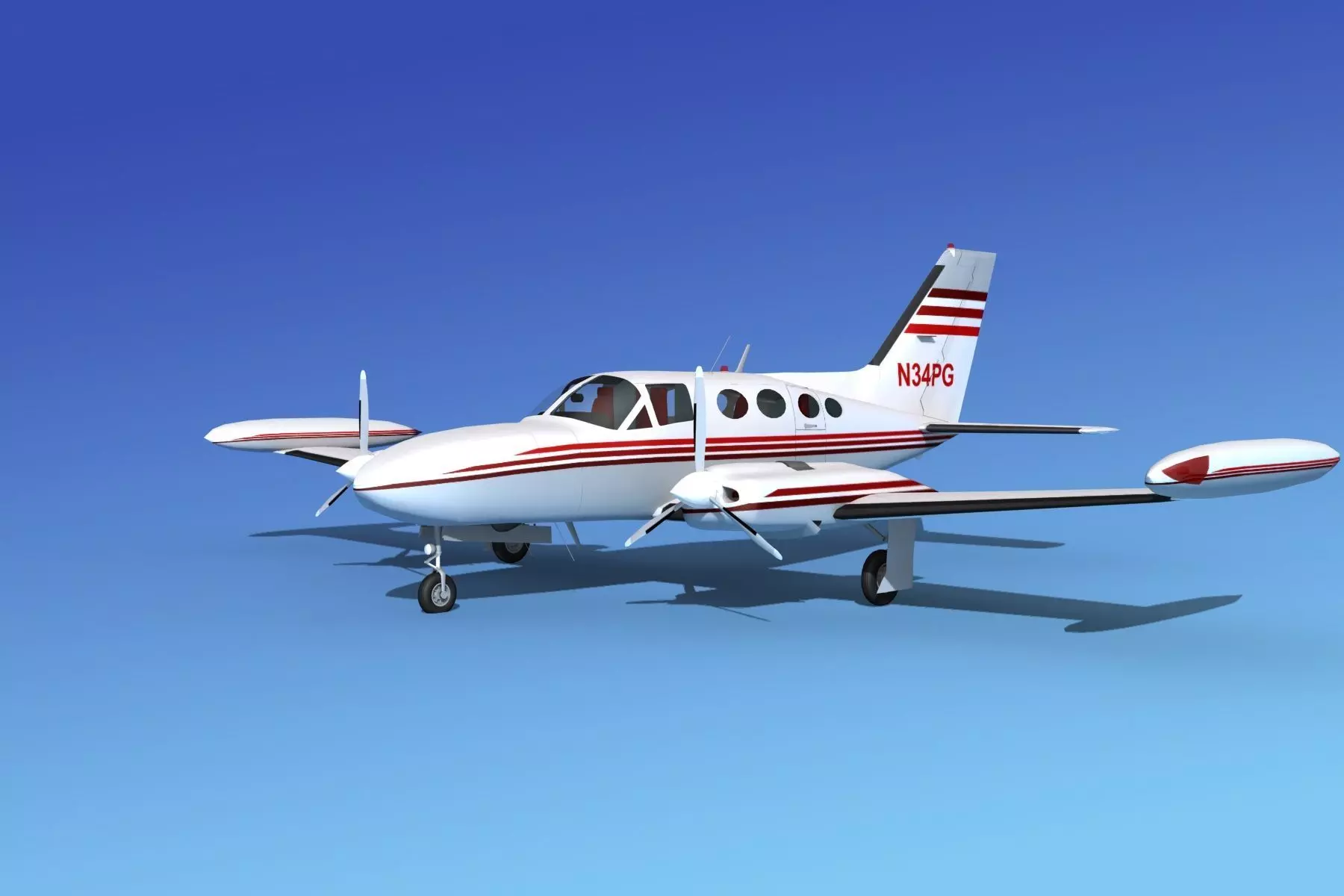 This model is built near to scale within a few inches of actual general dimensions in detail and fully textured. It hasmany animatable features including flaps, elevators, rudder, ailerons,propellers, landing gear and doors. The cockpit is viewable from the exterior showing detail. The interior cabinseating is also included. This model is also available in a wide range of formats . The Cessna 421 Golden Eagle is a further development of theearlier Cessna 411. It is a light twin-engine personal civilian transport aircraft. The Cessna 421 has seating for 6 passengers and crew. It can be flown by one or two crew members. The Cessna 421 uses Continental GTSIO-520-D engines. The propeller isgeared to reduce rpm off the crankshaft of the engines. The 421 a models were produced beginning in1967 and was redesigned and marketed in 1970 as the 421B. Some 421s were modified to accept the turboprop engines which made them very much like the Cessna 425.