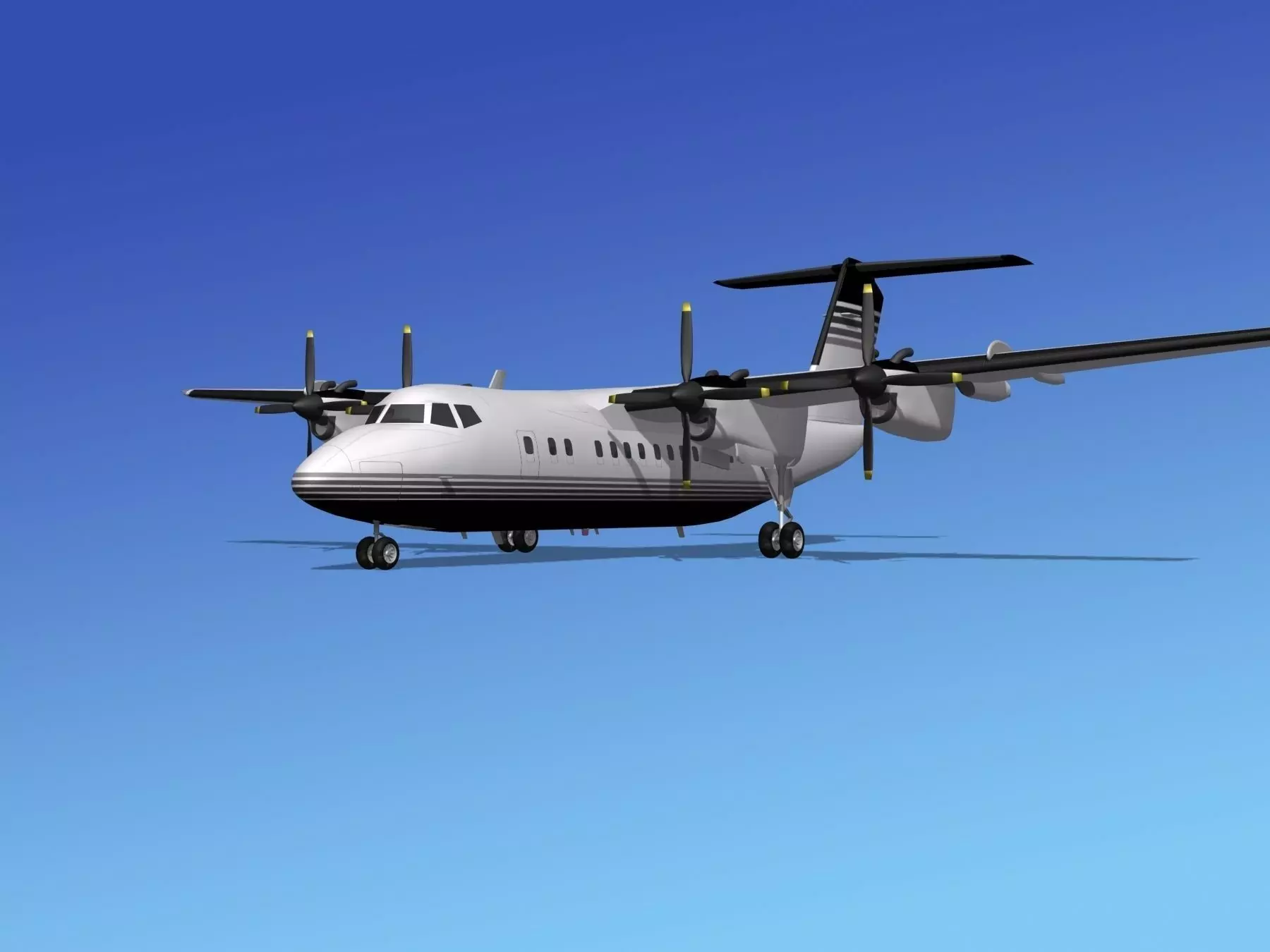 DHC-7-200 is built very near to scale, within a few inches of actual general dimensions. It includes many animateable features. The propellers, control surfaces, landing gear and landing gear doors are animateable or configurable. The model is fully textured and comes with several formats.