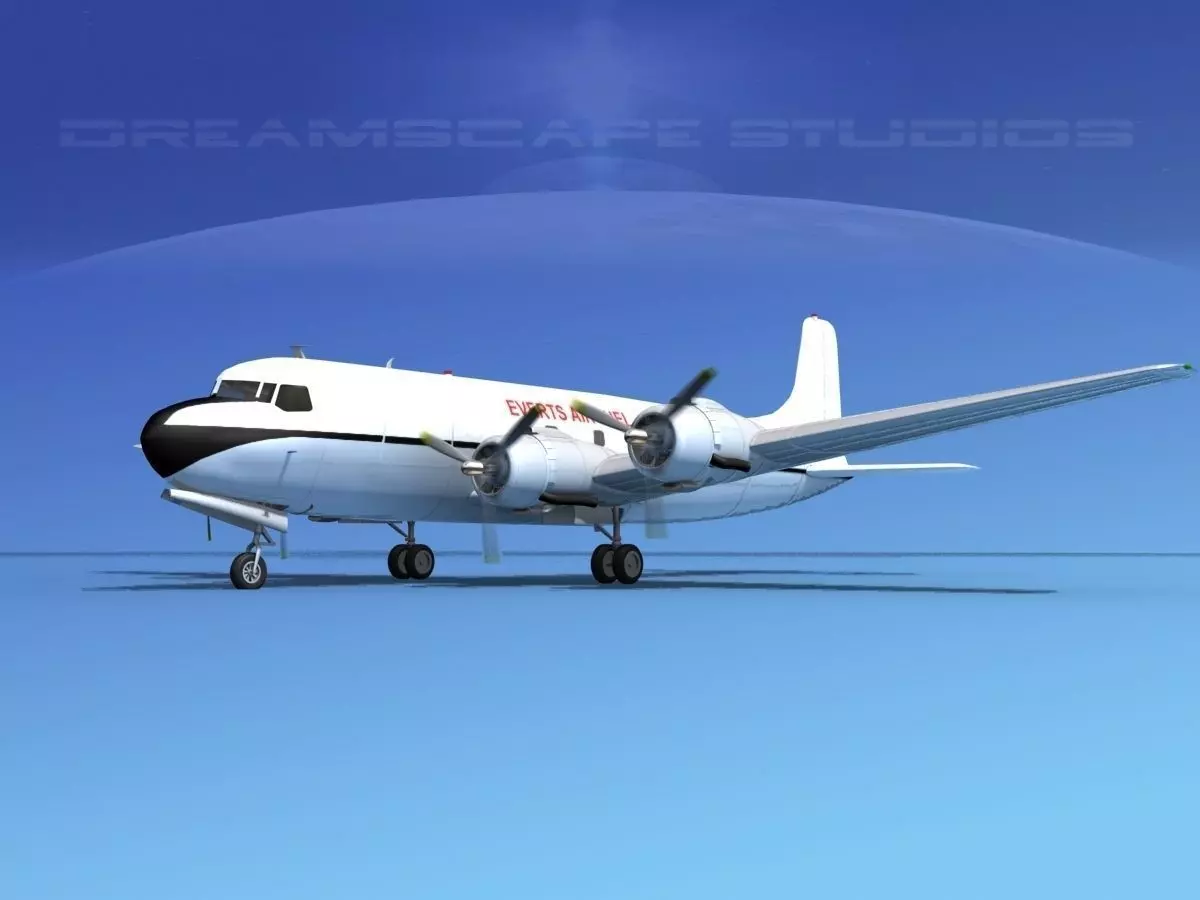 This high quality detailed polygonal model is built nearly scale for an accurate representation of the original object. All textures and materials are included and UVW mapped in most formats. It includes animateable landing gear, landing gear doors, ailerons, elevators, rudder and flaps. Propellers are animated. It comes in multiple formats and airline liveries.The Douglas DC-6 is a piston-powered airliner and transport aircraft built by the Douglas Aircraft Company from 1946 to 1958. Originally intended as a military transport near the end of World War II, it was reworked after the war in the long-range commercial transport market. More than 700 were built and many still fly today in cargo, military and wildfire control roles.The DC-6 was known as the C-118 Liftmaster in United States Air Force service and as the R6D in United States Navy service prior to 1962, after which all U.S. Navy variants were also designated as the C-118.
