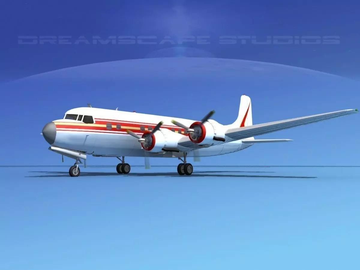 This high quality detailed polygonal model is built nearly scale for an accurate representation of the original object. All textures and materials are included and UVW mapped in most formats. It includes animateable landing gear, landing gear doors, ailerons, elevators, rudder and flaps. Propellers are animated. It comes in multiple formats and airline liveries.The Douglas DC-6 is a piston-powered airliner and transport aircraft built by the Douglas Aircraft Company from 1946 to 1958. Originally intended as a military transport near the end of World War II, it was reworked after the war in the long-range commercial transport market. More than 700 were built and many still fly today in cargo, military and wildfire control roles.The DC-6 was known as the C-118 Liftmaster in United States Air Force service and as the R6D in United States Navy service prior to 1962, after which all U.S. Navy variants were also designated as the C-118.